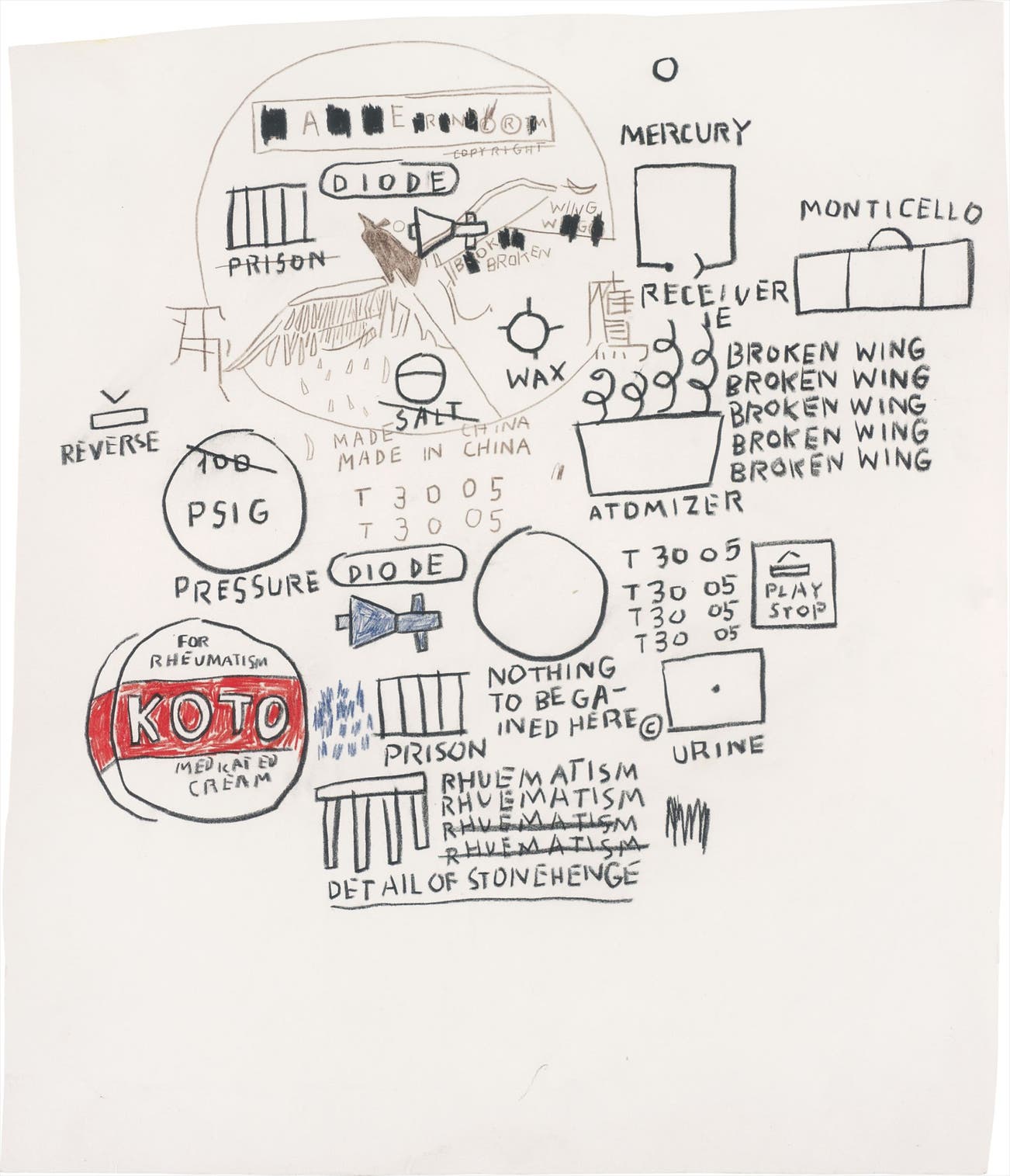 Basquiat began his career as a graffiti artist under the pseudonym SAMO, in the Lower East Side of Manhattan, New York. His graffiti background is apparent in the raw, fresh lines of the present lot. For Basquiat, drawing was not an inferior medium to painting, but had equal potential for expression and was uniquely able to articulate the energy of the artist. The style of street art is here fused with experiments in semiotics and reflects the artist’s inner thoughts and desires. Employing imagery from African, Aztec and Greek cultures as well as making reference to his own Puerto Rican and Haitian heritage, his style can be described as Neo-Expressionism, in the manner pioneered by Jean Dubuffet and Karel Appel. His references to other cultures are juxtaposed with references to the social climate of New York in the 1980s, revealing flawed power structures and hinting at fundamental failings in social discourse. The symbols in this work are elusive in their meaning, and the combinations of words and symbols are highly ambiguous, as references to prison, Stonehenge and rheumatism are placed side by side. The apparently random distribution and combinations of words and motifs mirror Basquiat’s inner train of thoughts, or stream of consciousness, which, combined with the raw style of drawing, imbues the image with a sense of intimacy and personal significance.