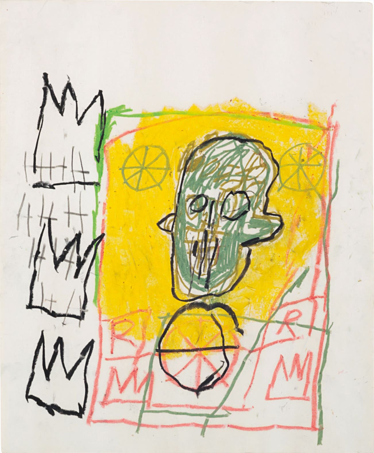 build up a face, marked with open, staring eyes and a vaguely defined mouth. The head pops forward against a screen of saffron yellow, loosely framed by lime and coral oil stick. Youthful pinwheel shapes, cross-hatched designs, and pointy crowns decorate the paper surface. Instinctive, yet concentrated, this drawing shows a human subject imbued with regal significance. In Untitled (head) Basquiat captures the exterior of the head with deliberate rawness, marking its basic forms in dove grey, turquoise, magenta, periwinkle and a warm violet oil pastel; these buoyant and whimsical colors contrast greatly to the usual deep reds and stern blacks common in 1981 and 1982. He depicts the cranium as lopsided, more rectangular than spherical, graphically suspended in the middle of the page. He circles the eye sockets with multiple irregular ovals, creating a sense of mysterious depth. The figure’s mouth, wide and gaping, is loosely suggested and a violently jagged line approximates a set of sharp teeth. Surgical stitches are hatched out on the forehead of the figure, adding to the overall half-living madness of the piece.