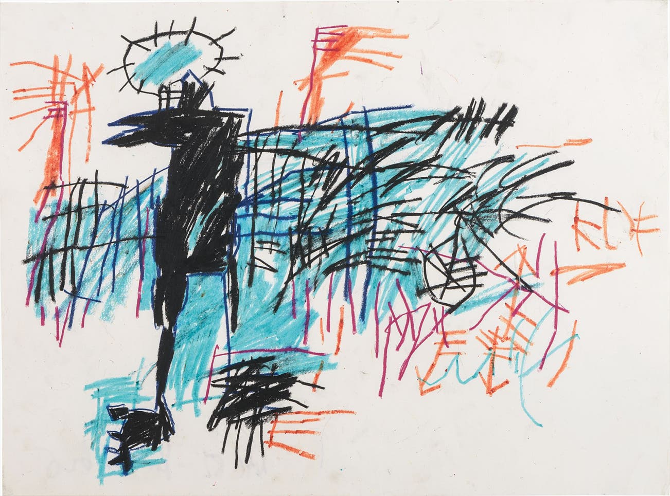 While the blackbird becomes a symbol of the fallen prince, the strong, repetitive lines, combined with the child-like innocence makes this work an embodiment of Basquiat’s energized and brilliantly chromatic dance.
