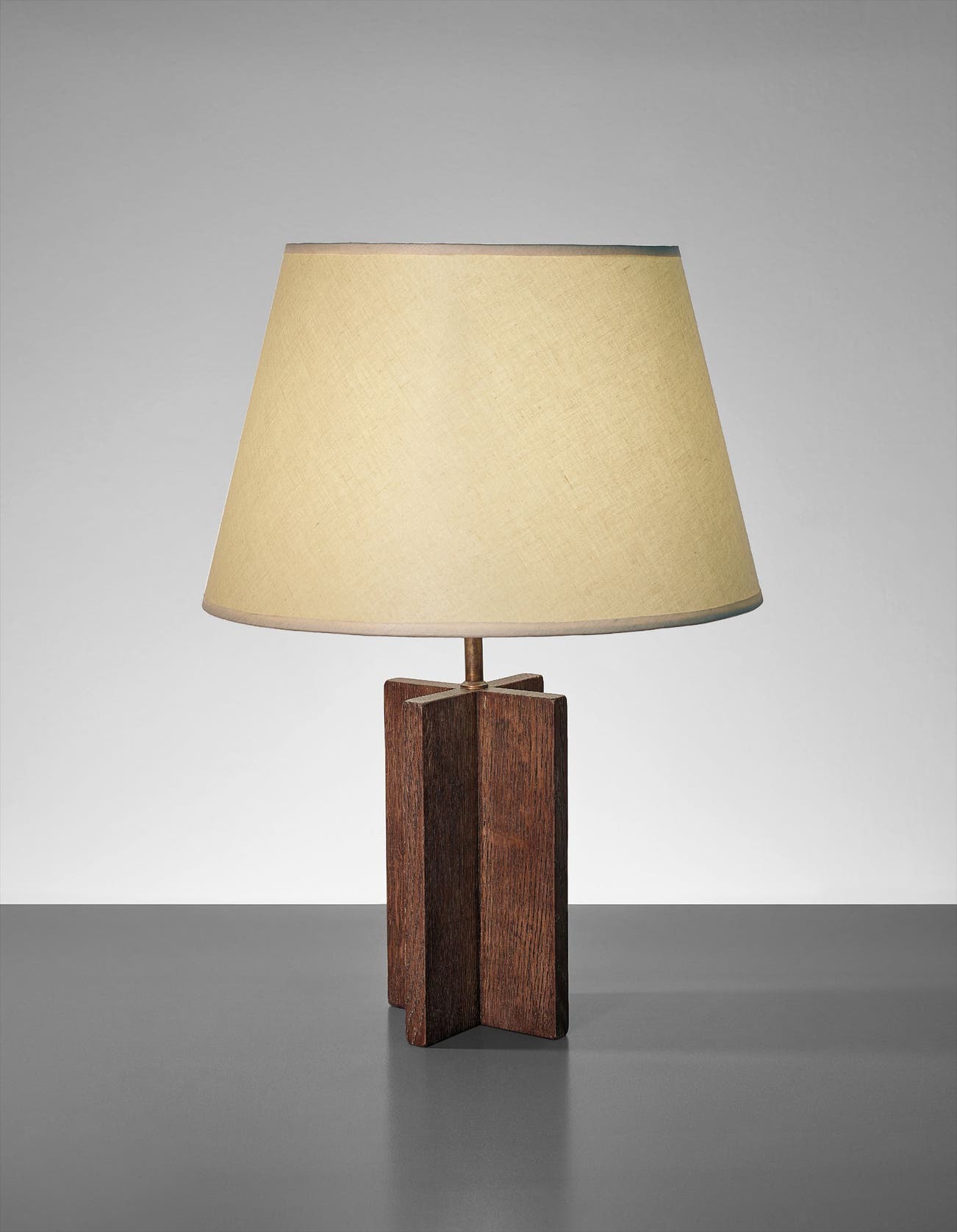 Sanded oak, tubular brass, linen shade.