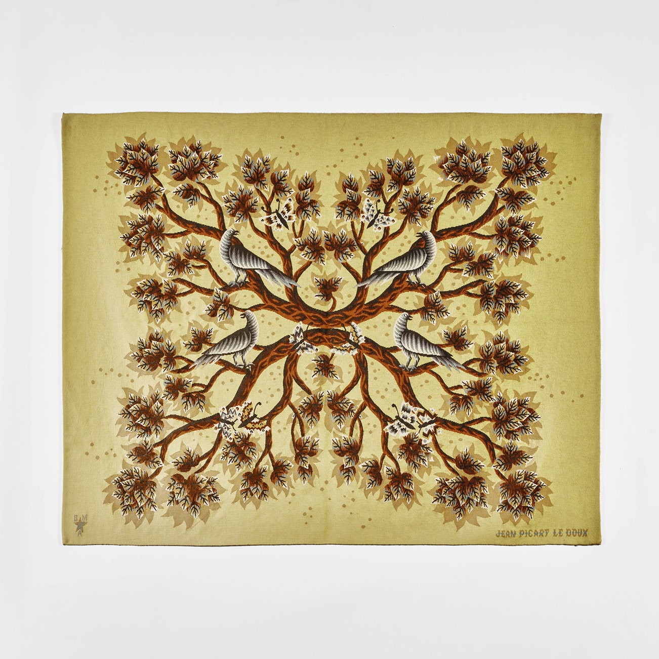 Produced by Maison M. Berthaut Aubusson, France. Lower left corner woven with firm's monogram, lower right corner woven JEAN PICART LE DOUX. Reverse with paper tag printed with title, dimensions, carton du Jean PICART LE DEUX/édité par Mason M. BERTHAUT/AUBUSSON/NO. 370 and firm's monogram . Further signed Jean Picart Le Deux and with applied fabric tag ANTIMITE DEFINITE MITIN.