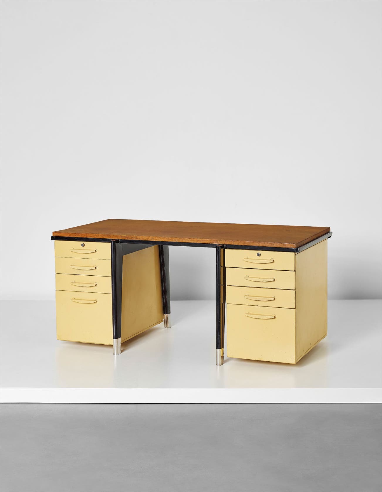 French | B. 1901 D. 1984Jean Prouvé believed in design as a vehicle for improvement. His manufactory Les Ateliers Jean Prouvé, located in Nancy, France, produced furniture for schools, factories and municipal projects, both within France and in locations as far flung as the Congo. Though he designed for the masses, pieces such as his "Potence" lamps and "Standard" chairs are among the most iconic fixtures in sophisticated, high-design interiors today. Collectors connect with his utilitarian, austere designs that strip materials down to the bare minimum without compromising on proportion or style.