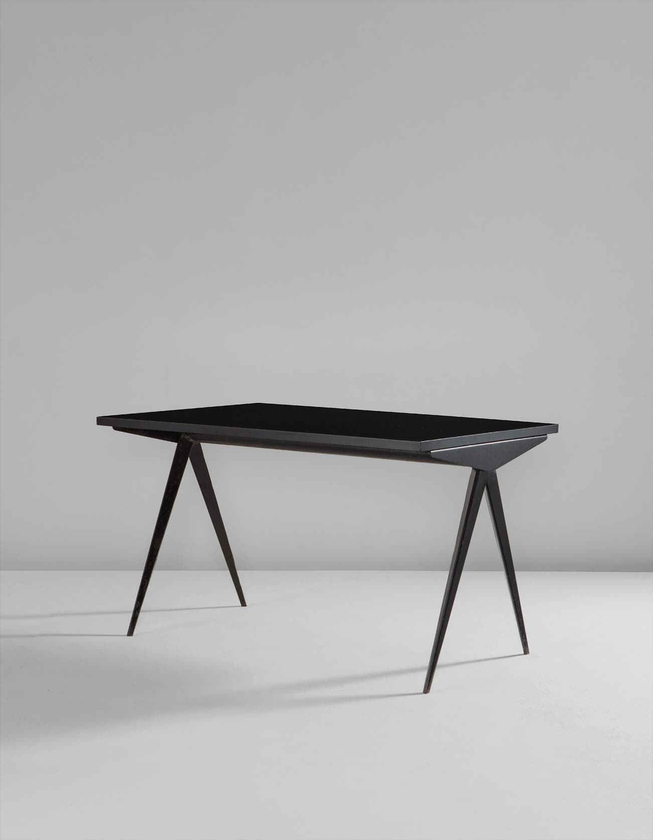 French | B. 1901 D. 1984Jean Prouvé believed in design as a vehicle for improvement. His manufactory Les Ateliers Jean Prouvé, located in Nancy, France, produced furniture for schools, factories and municipal projects, both within France and in locations as far flung as the Congo. Though he designed for the masses, pieces such as his "Potence" lamps and "Standard" chairs are among the most iconic fixtures in sophisticated, high-design interiors today. Collectors connect with his utilitarian, austere designs that strip materials down to the bare minimum without compromising on proportion or style.