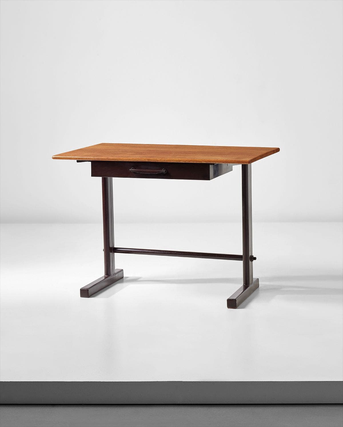 French | B. 1901 D. 1984Jean Prouvé believed in design as a vehicle for improvement. His manufactory Les Ateliers Jean Prouvé, located in Nancy, France, produced furniture for schools, factories and municipal projects, both within France and in locations as far flung as the Congo. Though he designed for the masses, pieces such as his "Potence" lamps and "Standard" chairs are among the most iconic fixtures in sophisticated, high-design interiors today. Collectors connect with his utilitarian, austere designs that strip materials down to the bare minimum without compromising on proportion or style.