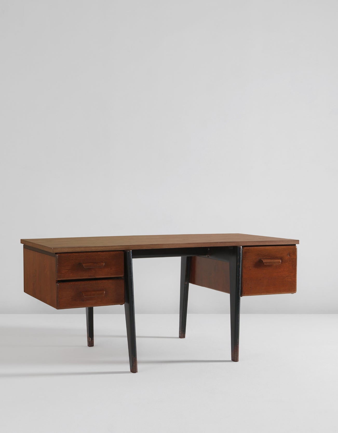 Jean Prouvé designed the “Standard desk” to accommodate standard-format drawers and hanging files, the configuration of which could be interchanged on either side of the folded sheet steel base.