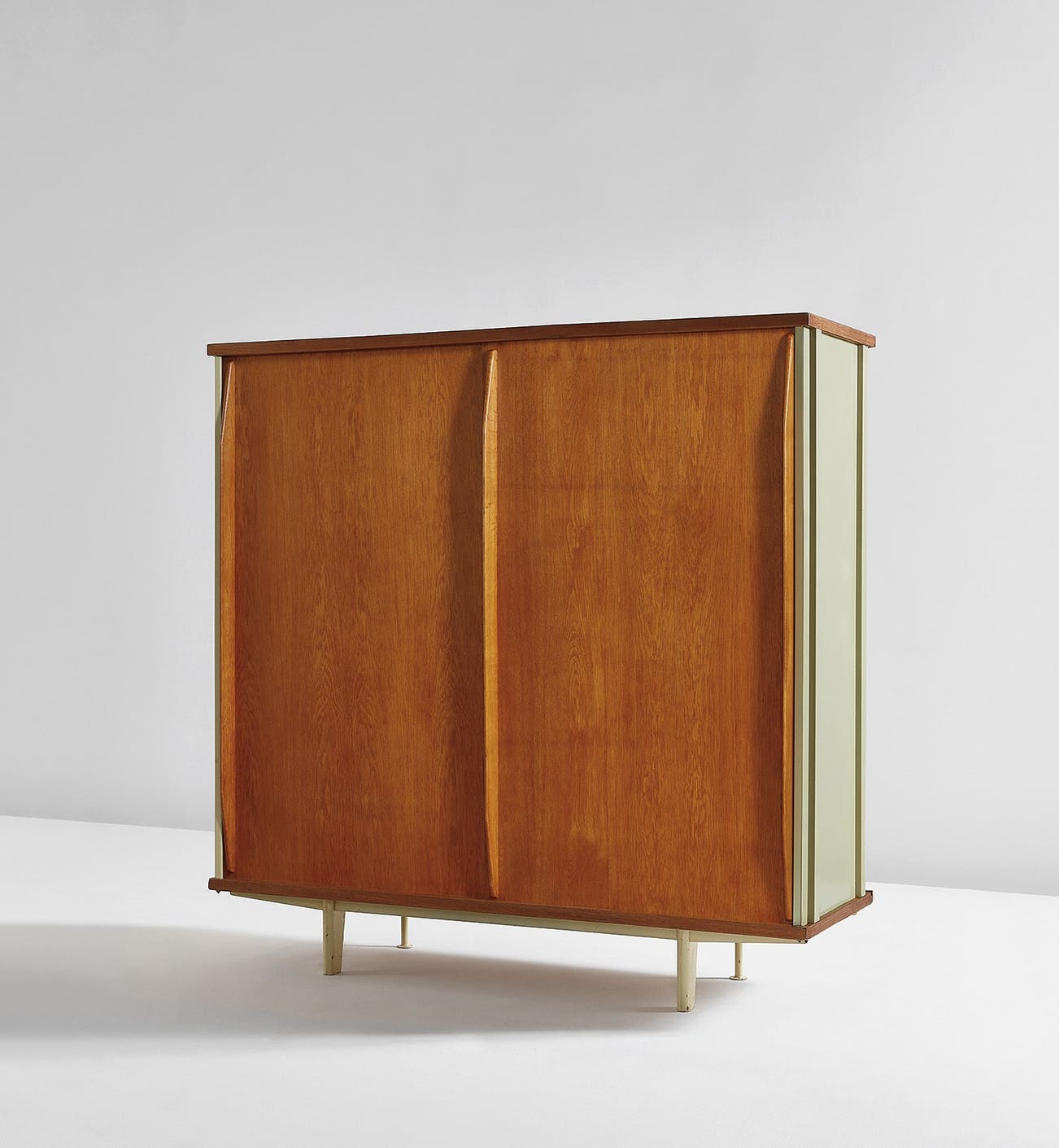 French | B. 1901 D. 1984Jean Prouvé believed in design as a vehicle for improvement. His manufactory Les Ateliers Jean Prouvé, located in Nancy, France, produced furniture for schools, factories and municipal projects, both within France and in locations as far flung as the Congo. Though he designed for the masses, pieces such as his "Potence" lamps and "Standard" chairs are among the most iconic fixtures in sophisticated, high-design interiors today. Collectors connect with his utilitarian, austere designs that strip materials down to the bare minimum without compromising on proportion or style.