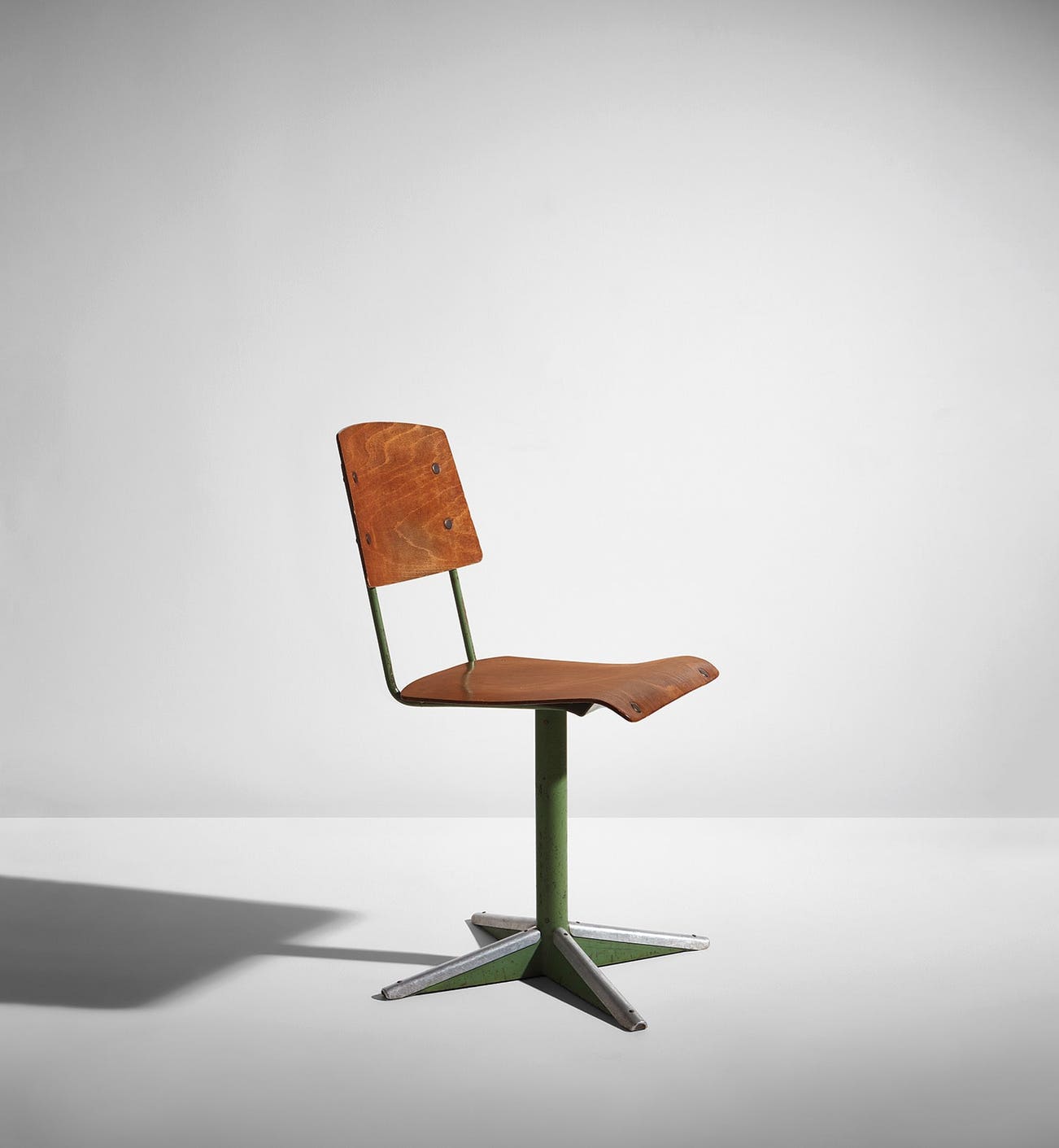 French | B. 1901 D. 1984Jean Prouvé believed in design as a vehicle for improvement. His manufactory Les Ateliers Jean Prouvé, located in Nancy, France, produced furniture for schools, factories and municipal projects, both within France and in locations as far flung as the Congo. Though he designed for the masses, pieces such as his "Potence" lamps and "Standard" chairs are among the most iconic fixtures in sophisticated, high-design interiors today. Collectors connect with his utilitarian, austere designs that strip materials down to the bare minimum without compromising on proportion or style.