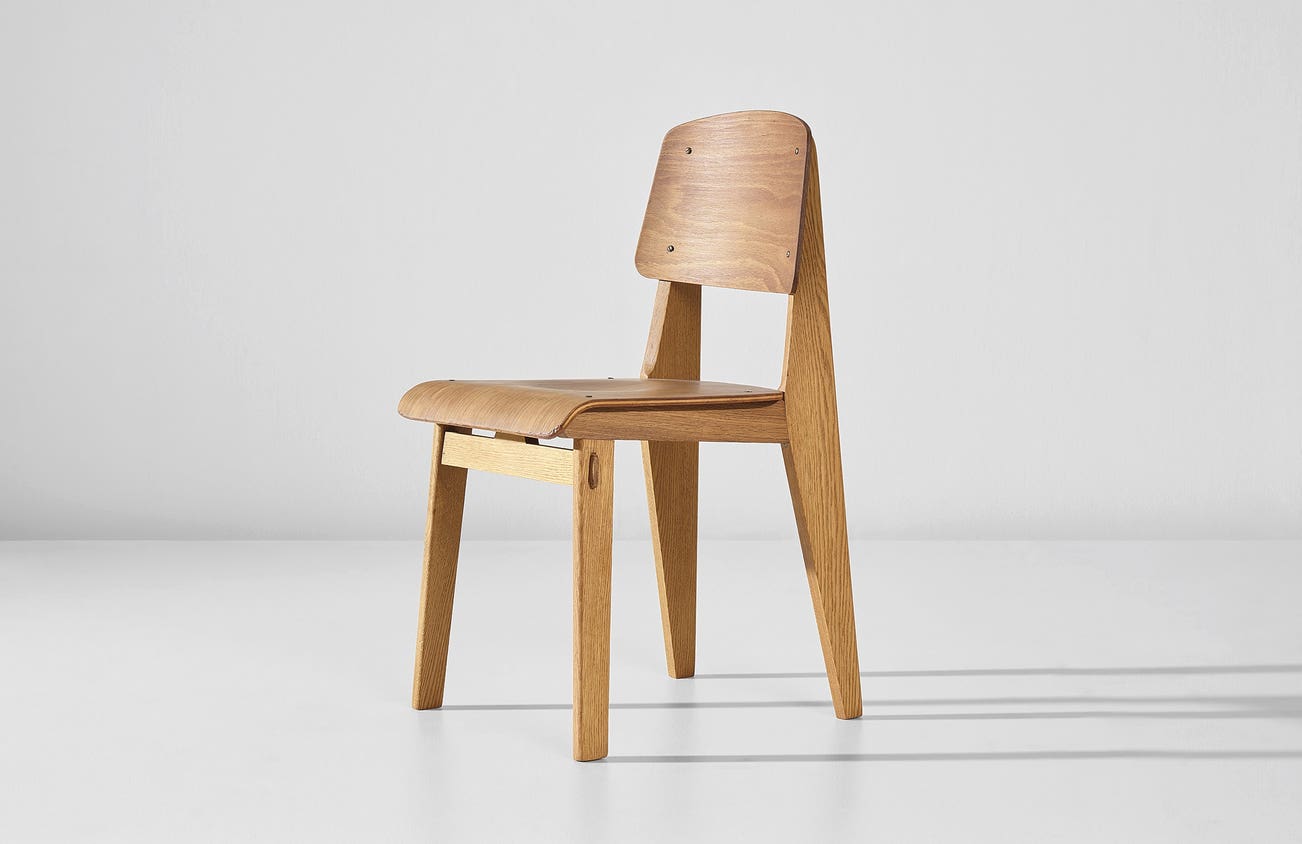 French | B. 1901 D. 1984Jean Prouvé believed in design as a vehicle for improvement. His manufactory Les Ateliers Jean Prouvé, located in Nancy, France, produced furniture for schools, factories and municipal projects, both within France and in locations as far flung as the Congo. Though he designed for the masses, pieces such as his "Potence" lamps and "Standard" chairs are among the most iconic fixtures in sophisticated, high-design interiors today. Collectors connect with his utilitarian, austere designs that strip materials down to the bare minimum without compromising on proportion or style.