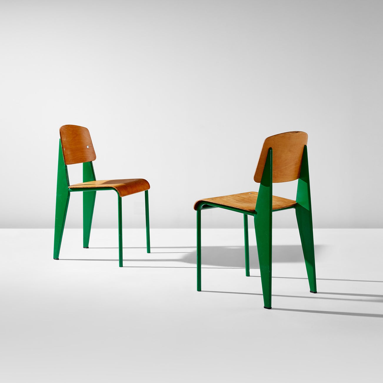 French | B. 1901 D. 1984Jean Prouvé believed in design as a vehicle for improvement. His manufactory Les Ateliers Jean Prouvé, located in Nancy, France, produced furniture for schools, factories and municipal projects, both within France and in locations as far flung as the Congo. Though he designed for the masses, pieces such as his "Potence" lamps and "Standard" chairs are among the most iconic fixtures in sophisticated, high-design interiors today. Collectors connect with his utilitarian, austere designs that strip materials down to the bare minimum without compromising on proportion or style.