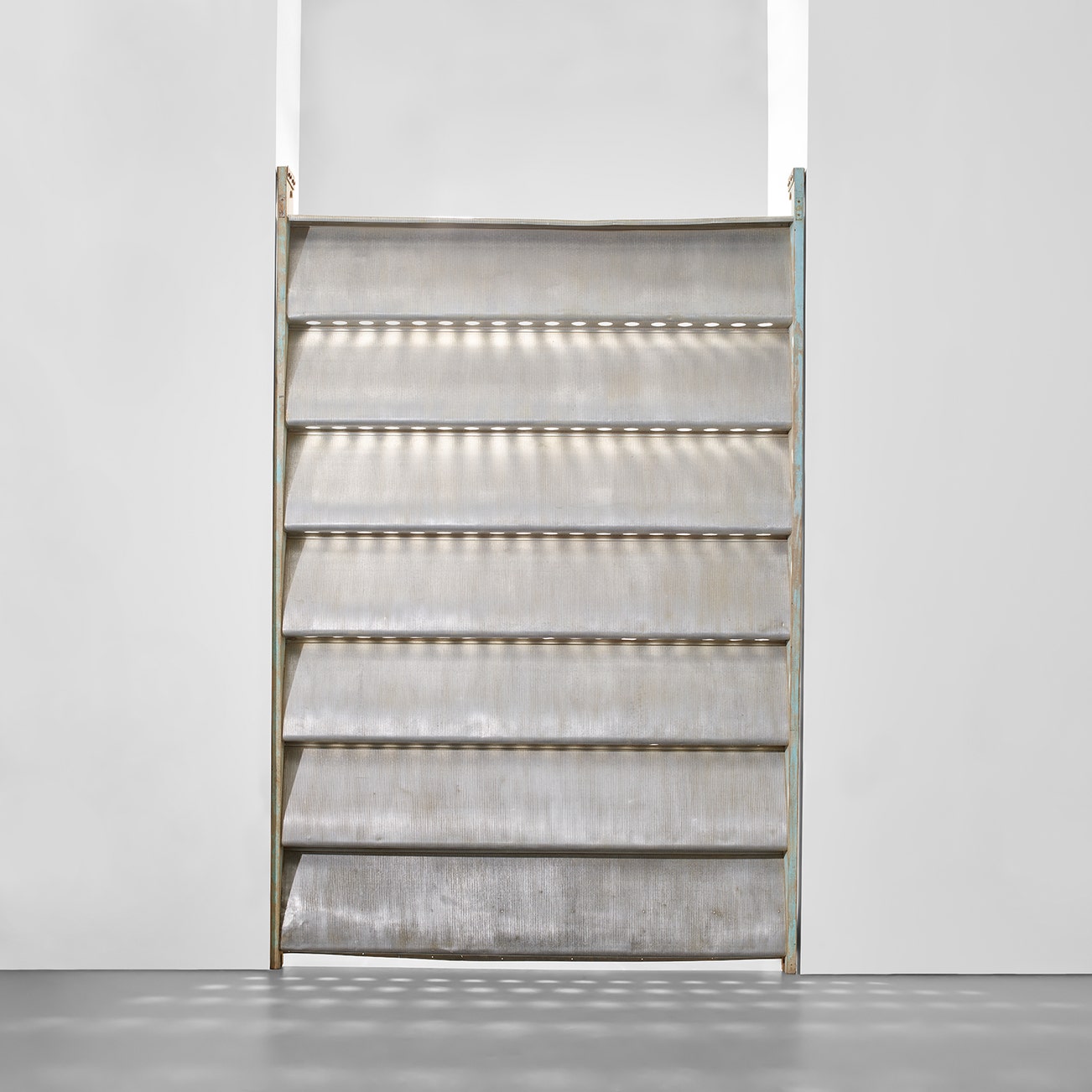These exceptional sun shutters (Lots 340 & 341) are a testament to mid-century French architect Jean Prouvé's innovative approach to building design. His signature use of industrial materials in architecture is apparent in the use of ribbed aluminium and painted wood. This material helped provide a relatively lightweight yet durable structure for the schools in Cameroon for which they were designed. Prouvé's sought-after designs truly exemplify the modernist construction principles of the period, emphasising the considered use of new materials to create functional and efficient structures. The two sun shutters are striking examples of this approach, with their sleek and industrial aesthetic. At over 2.5 meters tall, they are impressive pieces that showcase the architect’s mastery of scale and can be used both indoors and outdoors.