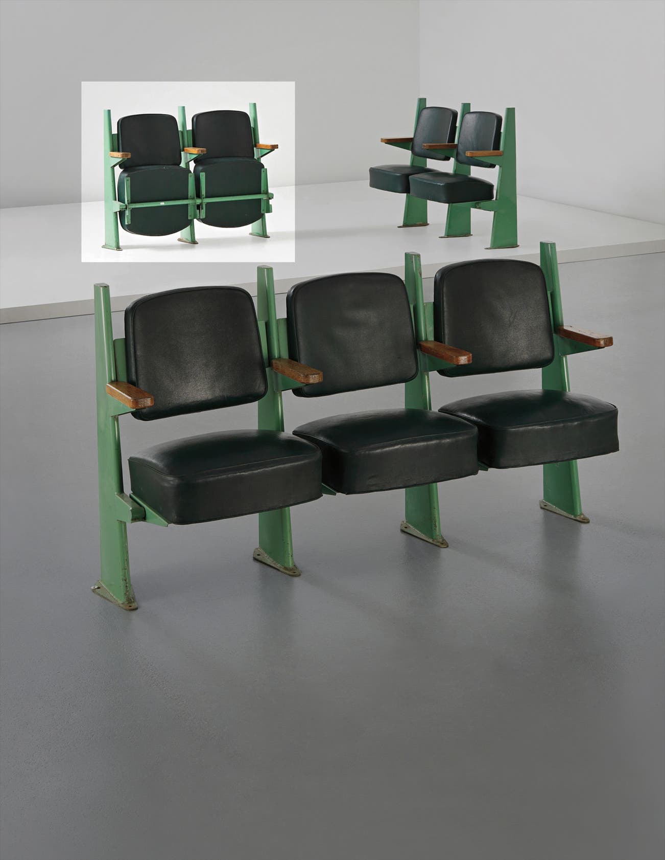 Row of two lecture theatre chairs with adjustable seats, designed for the Faculté de Lettres, Université de Besançon