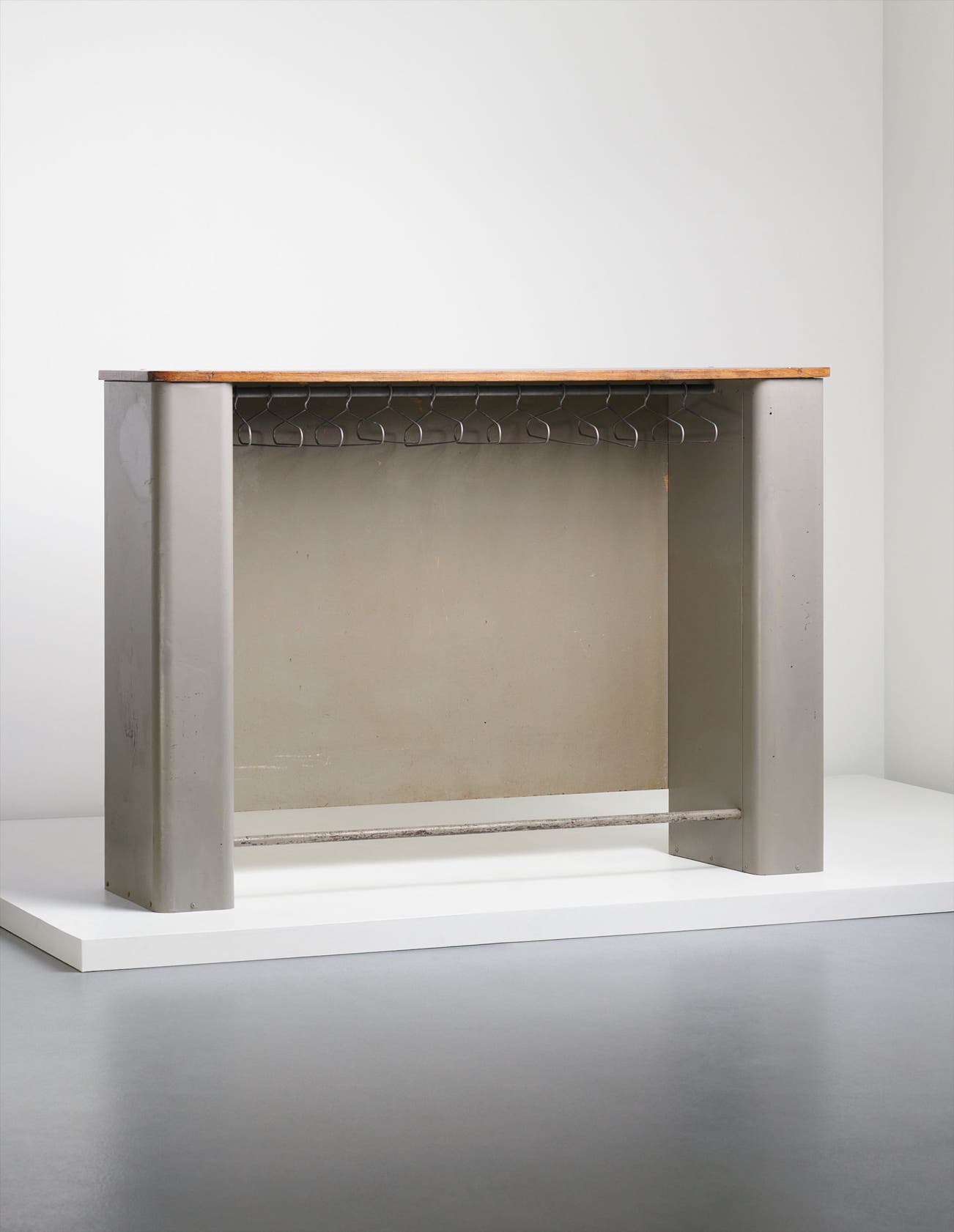 French | B. 1901 D. 1984Jean Prouvé believed in design as a vehicle for improvement. His manufactory Les Ateliers Jean Prouvé, located in Nancy, France, produced furniture for schools, factories and municipal projects, both within France and in locations as far flung as the Congo. Though he designed for the masses, pieces such as his "Potence" lamps and "Standard" chairs are among the most iconic fixtures in sophisticated, high-design interiors today. Collectors connect with his utilitarian, austere designs that strip materials down to the bare minimum without compromising on proportion or style.