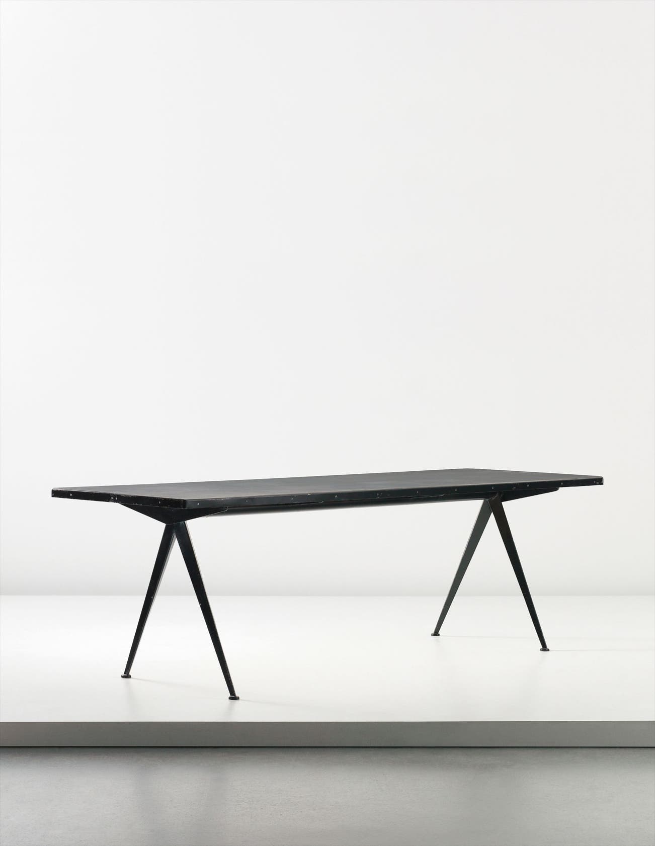 French | B. 1901 D. 1984Jean Prouvé believed in design as a vehicle for improvement. His manufactory Les Ateliers Jean Prouvé, located in Nancy, France, produced furniture for schools, factories and municipal projects, both within France and in locations as far flung as the Congo. Though he designed for the masses, pieces such as his "Potence" lamps and "Standard" chairs are among the most iconic fixtures in sophisticated, high-design interiors today. Collectors connect with his utilitarian, austere designs that strip materials down to the bare minimum without compromising on proportion or style.