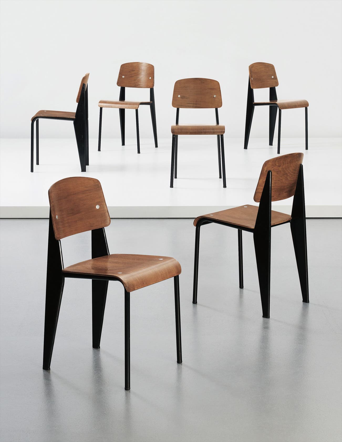 French | B. 1901 D. 1984Jean Prouvé believed in design as a vehicle for improvement. His manufactory Les Ateliers Jean Prouvé, located in Nancy, France, produced furniture for schools, factories and municipal projects, both within France and in locations as far flung as the Congo. Though he designed for the masses, pieces such as his "Potence" lamps and "Standard" chairs are among the most iconic fixtures in sophisticated, high-design interiors today. Collectors connect with his utilitarian, austere designs that strip materials down to the bare minimum without compromising on proportion or style.