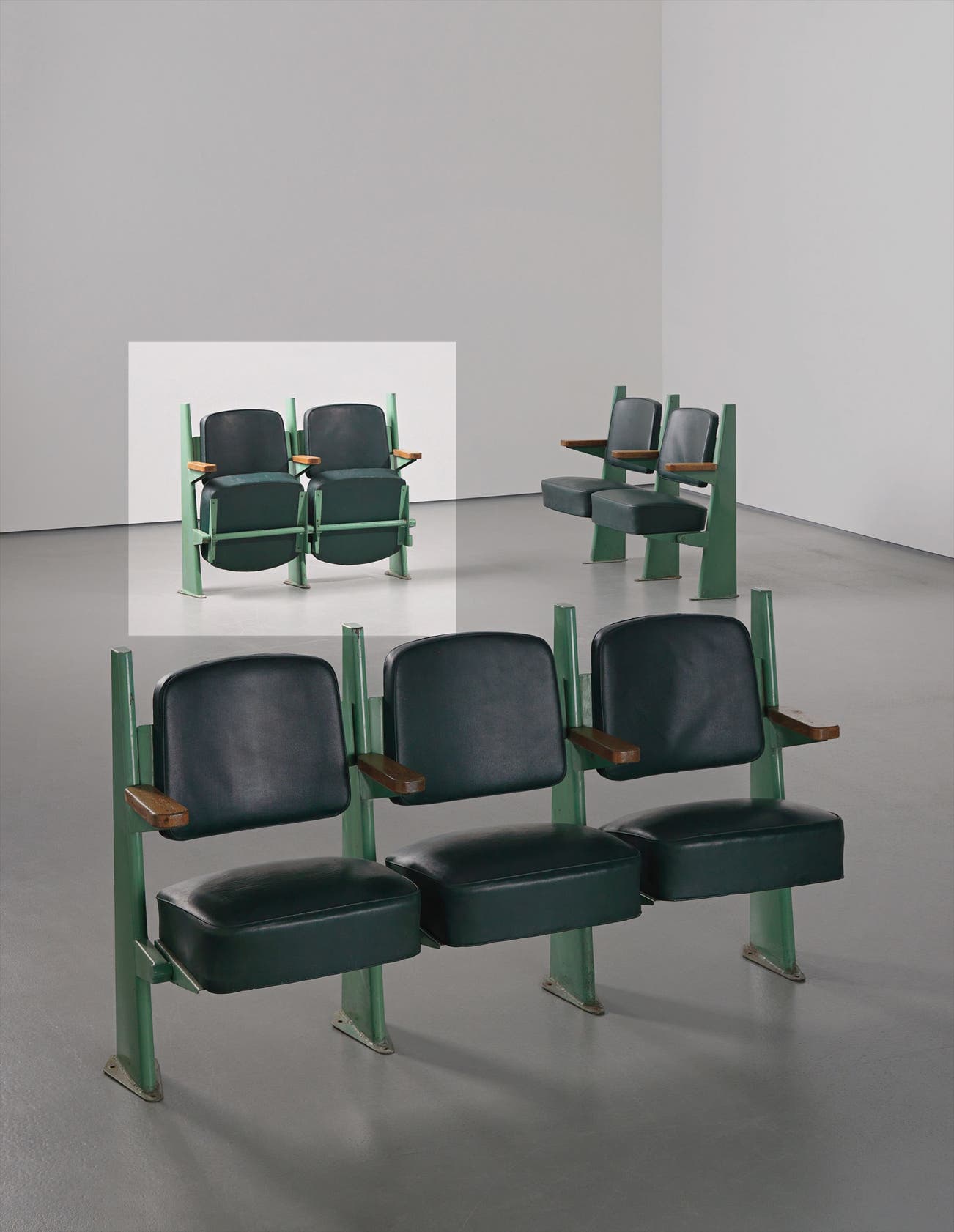 Row of two lecture theatre chairs with adjustable seats, designed for the Faculté de Lettres, Université de Besançon