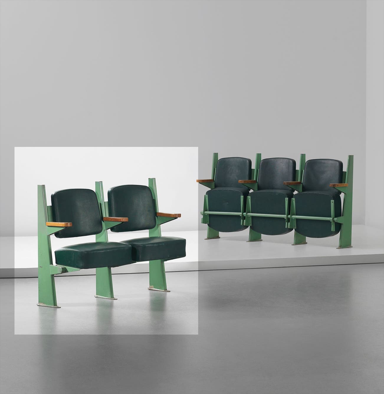 Row of two lecture theatre chairs with adjustable seats, designed for the Faculté des Lettres, Université de Besançon