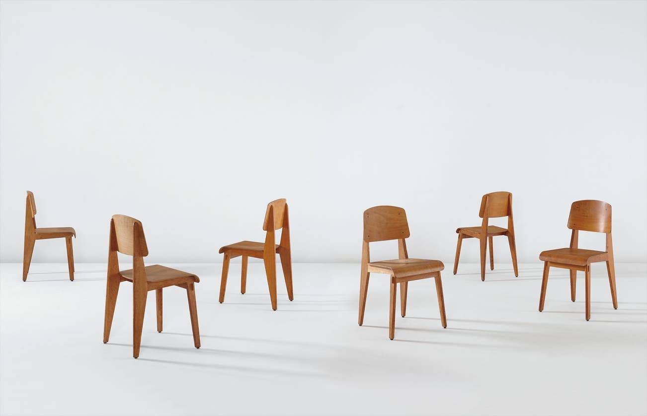 French | B. 1901 D. 1984Jean Prouvé believed in design as a vehicle for improvement. His manufactory Les Ateliers Jean Prouvé, located in Nancy, France, produced furniture for schools, factories and municipal projects, both within France and in locations as far flung as the Congo. Though he designed for the masses, pieces such as his "Potence" lamps and "Standard" chairs are among the most iconic fixtures in sophisticated, high-design interiors today. Collectors connect with his utilitarian, austere designs that strip materials down to the bare minimum without compromising on proportion or style.