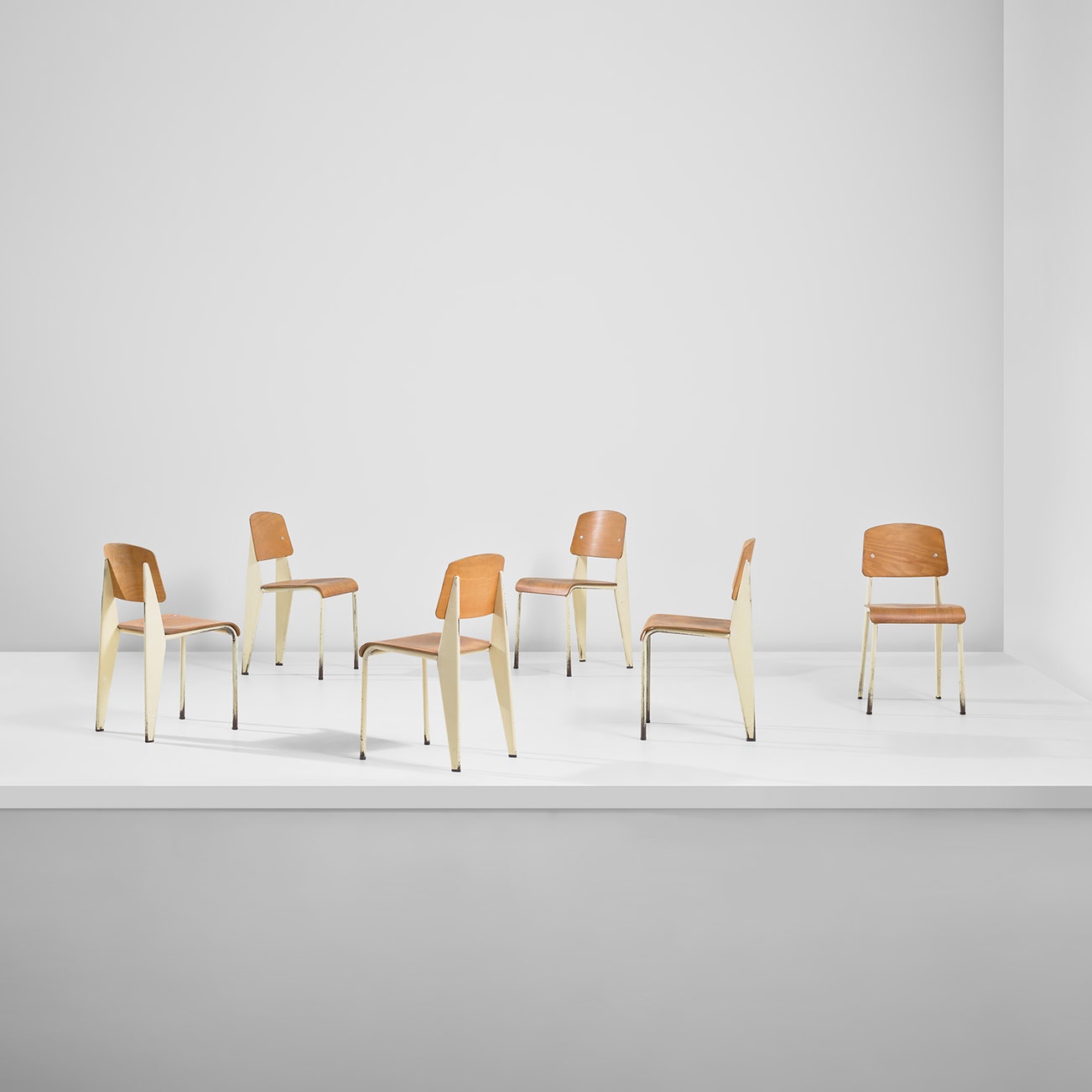 French | B. 1901 D. 1984Jean Prouvé believed in design as a vehicle for improvement. His manufactory Les Ateliers Jean Prouvé, located in Nancy, France, produced furniture for schools, factories and municipal projects, both within France and in locations as far flung as the Congo. Though he designed for the masses, pieces such as his "Potence" lamps and "Standard" chairs are among the most iconic fixtures in sophisticated, high-design interiors today. Collectors connect with his utilitarian, austere designs that strip materials down to the bare minimum without compromising on proportion or style.