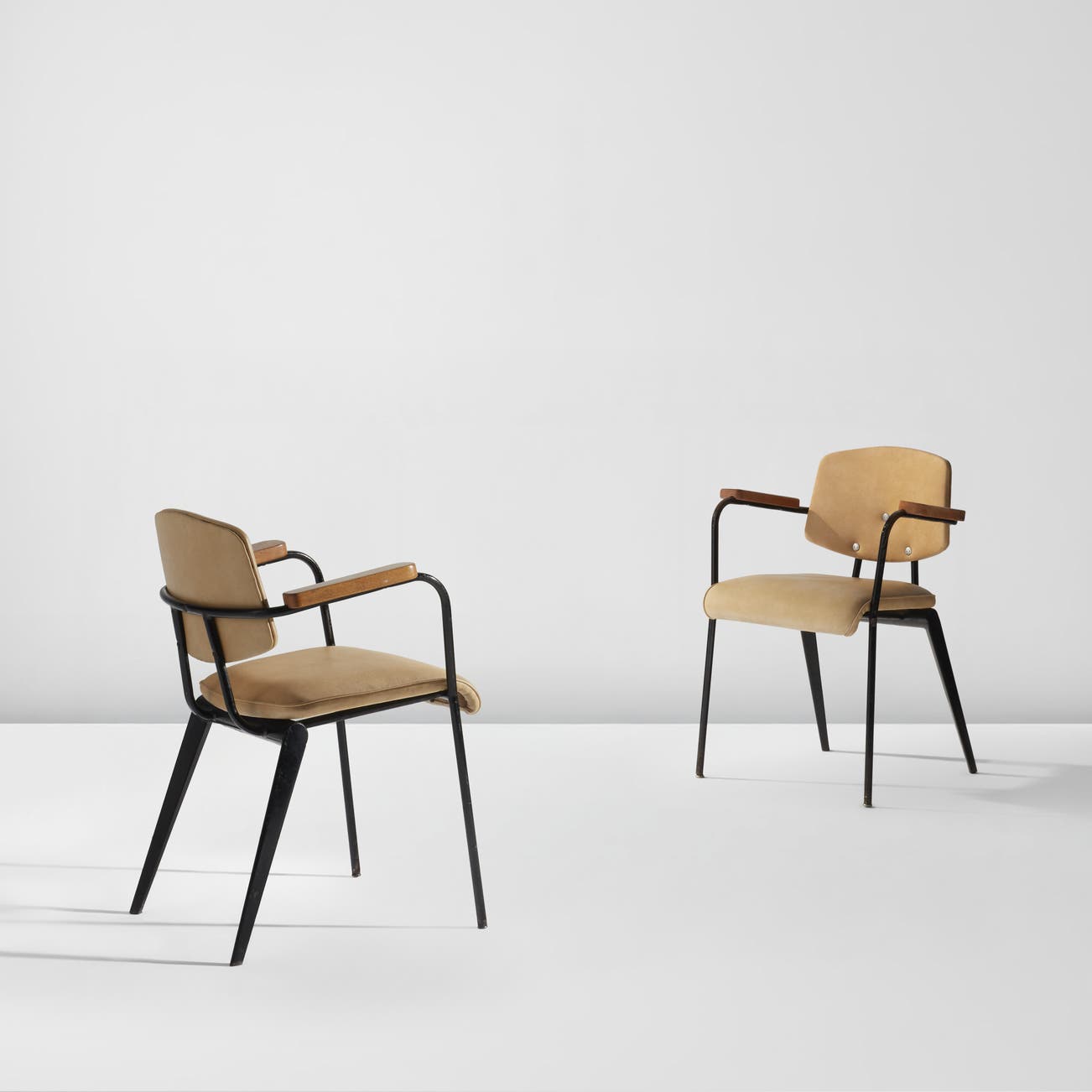 French | B. 1901 D. 1984Jean Prouvé believed in design as a vehicle for improvement. His manufactory Les Ateliers Jean Prouvé, located in Nancy, France, produced furniture for schools, factories and municipal projects, both within France and in locations as far flung as the Congo. Though he designed for the masses, pieces such as his "Potence" lamps and "Standard" chairs are among the most iconic fixtures in sophisticated, high-design interiors today. Collectors connect with his utilitarian, austere designs that strip materials down to the bare minimum without compromising on proportion or style.