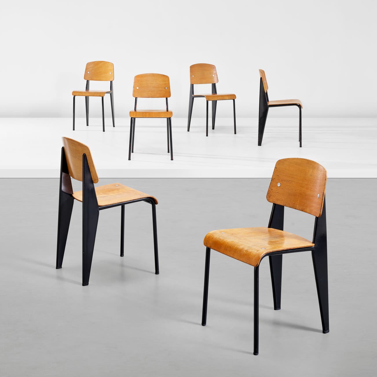 French | B. 1901 D. 1984Jean Prouvé believed in design as a vehicle for improvement. His manufactory Les Ateliers Jean Prouvé, located in Nancy, France, produced furniture for schools, factories and municipal projects, both within France and in locations as far flung as the Congo. Though he designed for the masses, pieces such as his "Potence" lamps and "Standard" chairs are among the most iconic fixtures in sophisticated, high-design interiors today. Collectors connect with his utilitarian, austere designs that strip materials down to the bare minimum without compromising on proportion or style.