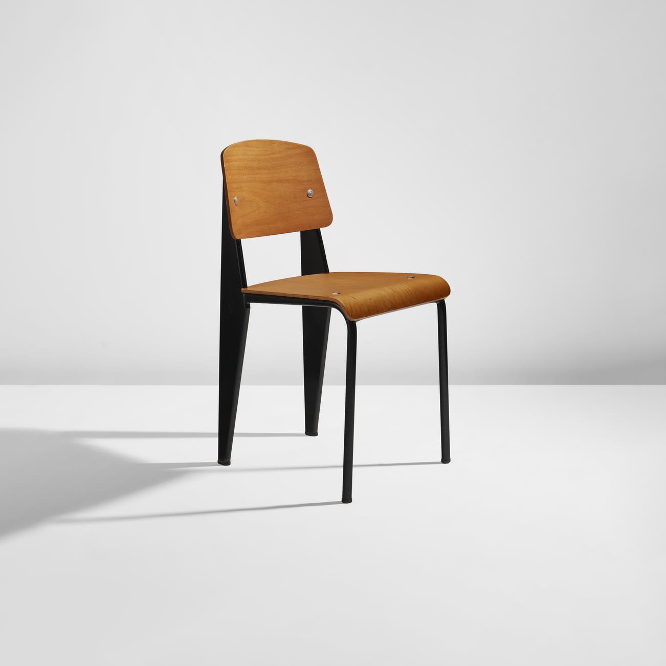 French | B. 1901 D. 1984Jean Prouvé believed in design as a vehicle for improvement. His manufactory Les Ateliers Jean Prouvé, located in Nancy, France, produced furniture for schools, factories and municipal projects, both within France and in locations as far flung as the Congo. Though he designed for the masses, pieces such as his "Potence" lamps and "Standard" chairs are among the most iconic fixtures in sophisticated, high-design interiors today. Collectors connect with his utilitarian, austere designs that strip materials down to the bare minimum without compromising on proportion or style.