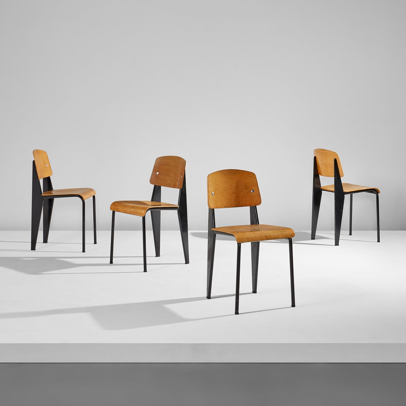 French | B. 1901 D. 1984Jean Prouvé believed in design as a vehicle for improvement. His manufactory Les Ateliers Jean Prouvé, located in Nancy, France, produced furniture for schools, factories and municipal projects, both within France and in locations as far flung as the Congo. Though he designed for the masses, pieces such as his "Potence" lamps and "Standard" chairs are among the most iconic fixtures in sophisticated, high-design interiors today. Collectors connect with his utilitarian, austere designs that strip materials down to the bare minimum without compromising on proportion or style.