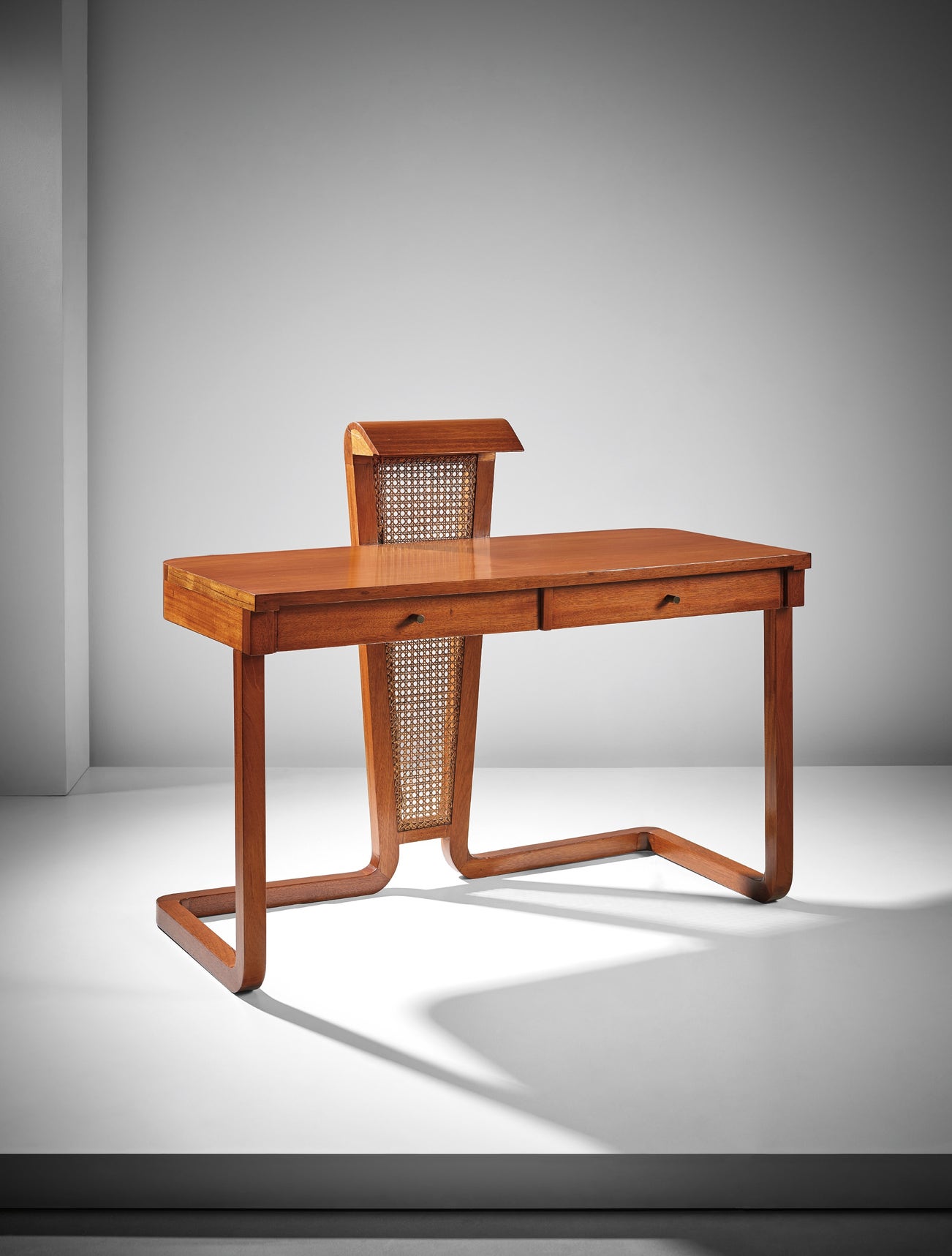 Mahogany, cane, brass.