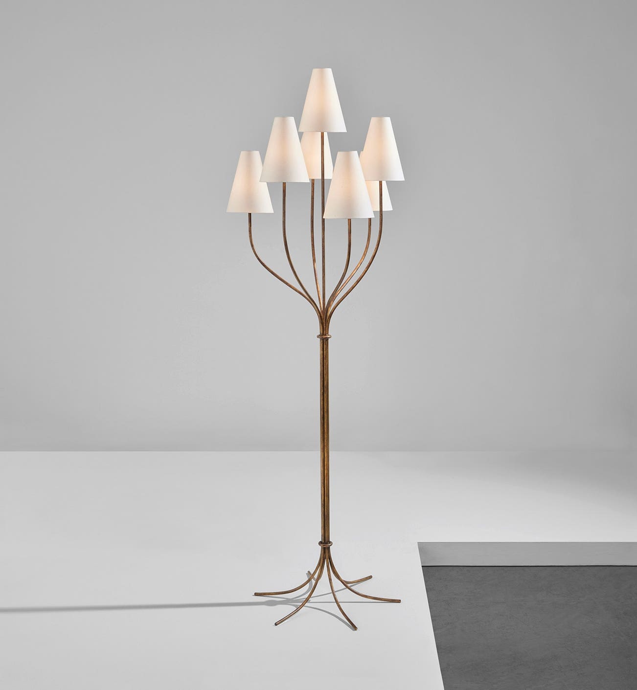 Jean Royère featured his Persane floor lamp in the 1954 Salon des arts ménagers as part of a bedroom setting alongside an Œuf chair in fuzzy gray and red upholstery and a Flaque coffee table in black straw marquetry with a constellation of golden straw stars. Against a large light green curtain in the background, the long graceful arms of the Persane stood “gushing like meteors to carry off the light,” in the words of René Chavance, who reviewed the Salon for the April 1954 issue of Mobilier et Décoration.