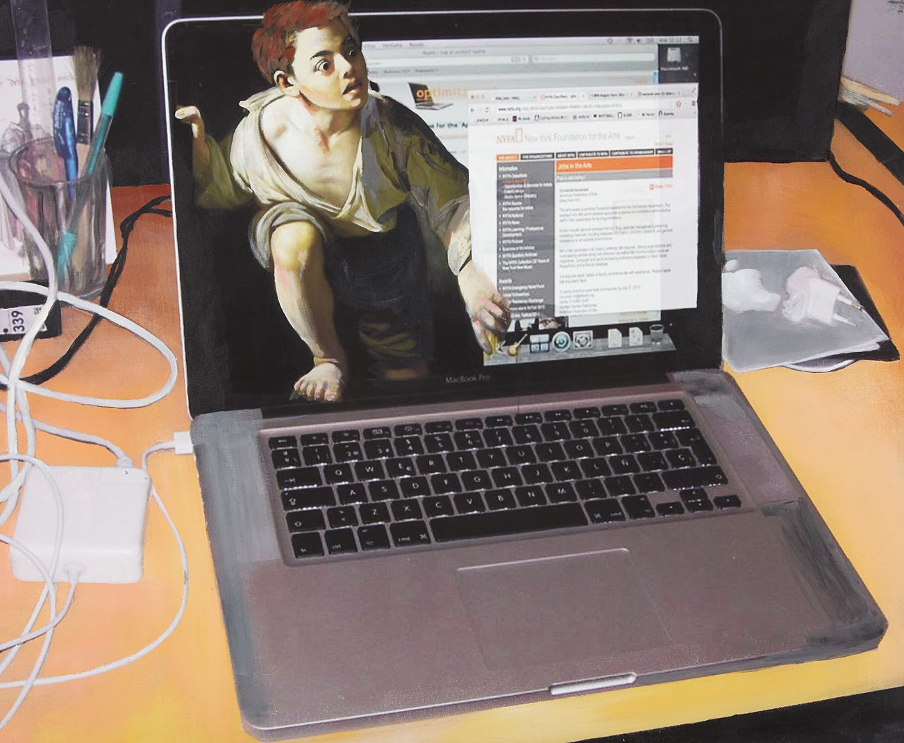 Jeanette Hayes is equally influenced by pop culture, the Internet’s ephemerality, and the canon of art history, often merging these subjects in a humorous way that reflects a contemporary sensibility. Using social media as her sketchpad, Hayes communicates through animated GIFs, jpegs, videos, and text, experimenting with various media to work through ideas before bringing them back to the canvas. Her celebratory and playful tone resonates with an emerging generation of artists working online for whom digital technologies aren’t necessarily the final medium. (Text by Paddles ON! curator Lindsay Howard)