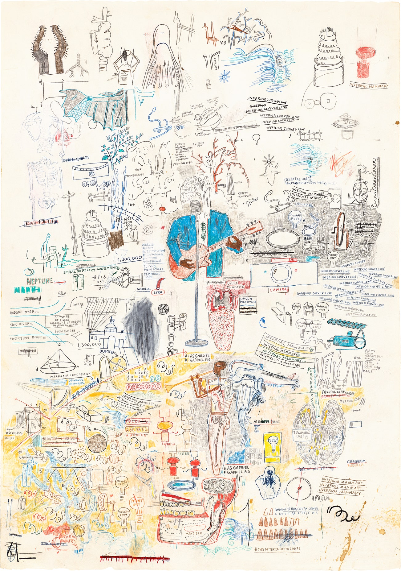Basquiat's iconoclastic oeuvre revolves around the human figure. Exploiting the creative potential of free association and past experience, he created deeply personal, often autobiographical, images by drawing liberally from such disparate fields as urban street culture, music, poetry, Christian iconography, African-American and Aztec cultural histories and a broad range of art historical sources.