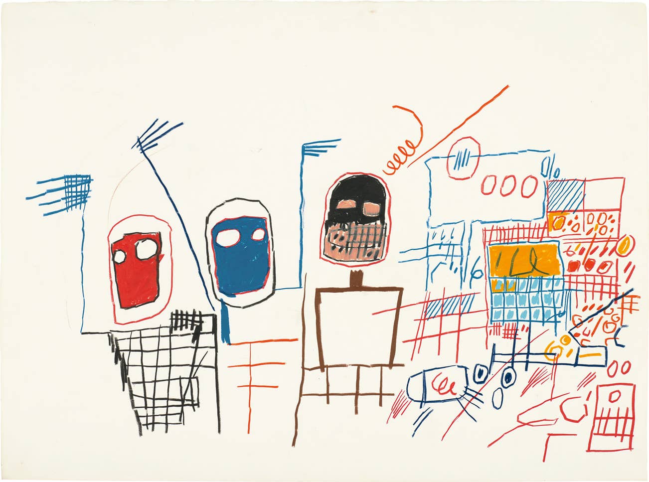 Resplendent with the key visual characteristics that define Basquiat’s enduring vision, Untitled is a paradigmatic work demonstrating the artist’s skill in drawing, the quintessential foundation of his artistic practice. The symbolic weight of pop culture and the graphic potency of graffiti underpinned the visual lexicon that Basquiat later introduced into the arena of fine art. In Untitled, the unbridled immediacy of drawing conjures an image that performs in a mode of free association. Delineating the silhouettes of three human figures alongside interlocked grids, Untitled appears to put together a scene from downtown New York, its noise evidenced by repeated loops and lines echoing cartoon iconography, and its heat embodied by the vibrant colours penetrating the contours of each drawn figure and building. Brought to life through the artist’s hand, this city vista is a testament to Basquiat’s ability to convey an image replete with real-life associations through the essential craft of drawing.