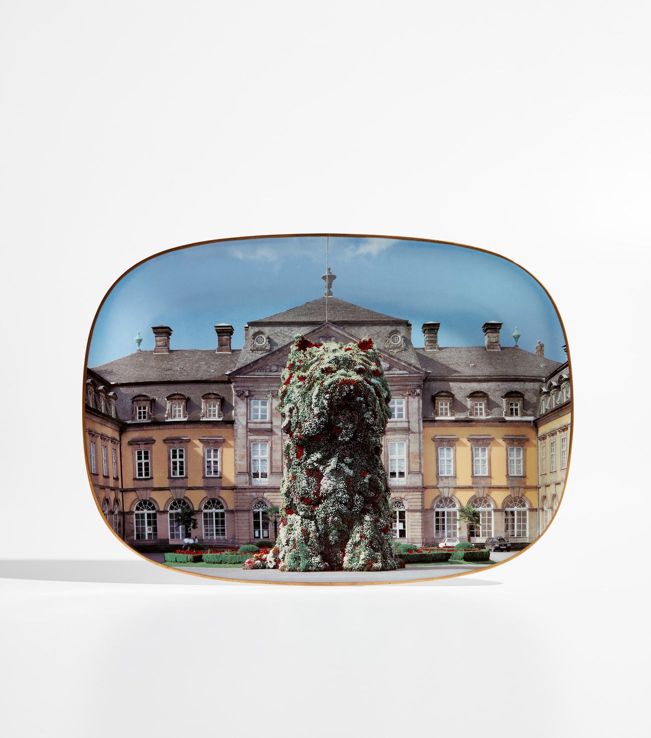 Porcelain plate multiple in colors, contained in the original Styrofoam-lined cardboard box.