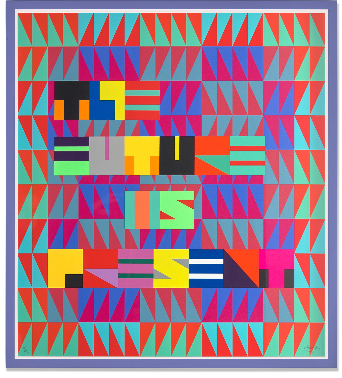 Screenprint and archival inkjet print in colors with collage, on Hahnemühle Museum Etching paper, contained in the original purple artist specified frame.