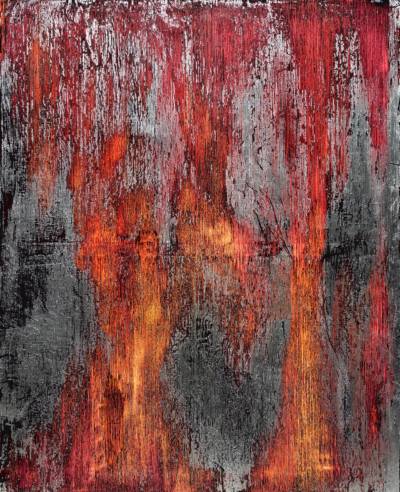 emulsion, plaster, silver foil, and ash on canvas