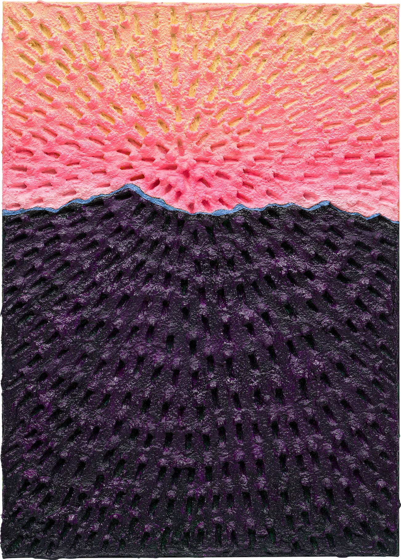 Light on the Mountain (Painted Green Sand #7A, Light Pink-Pink-Orange-Yellow Sky, Dark Purple-Blue Mountain, Green Ground)