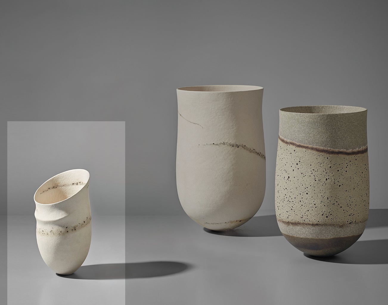'Pale, tilted rim, asymmetric, ridge, speckled bands' pot