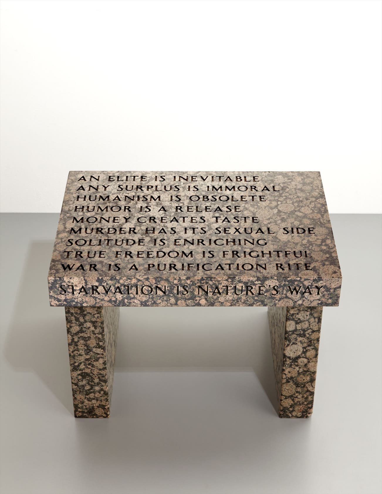 American | 1950Jenny Holzer is a Conceptual artist best known for her text-based public art projects. Holzer's work speaks of violence, oppression, sexuality, feminism, power, war and death. Throughout the years, Holzer has employed a variety of media, from a T-shirt to a plaque to an LED sign. Starting in the 1970s with the New York City posters, and continuing through her recent light projections on landscape and architecture, she uses her art as a form of communication and commentary. Holzer's art hangs in important collections around the globe including 7 World Trade Center, the Venice Biennale, the Guggenheim Museums in New York and Bilbao and the Whitney Museum of American Art.