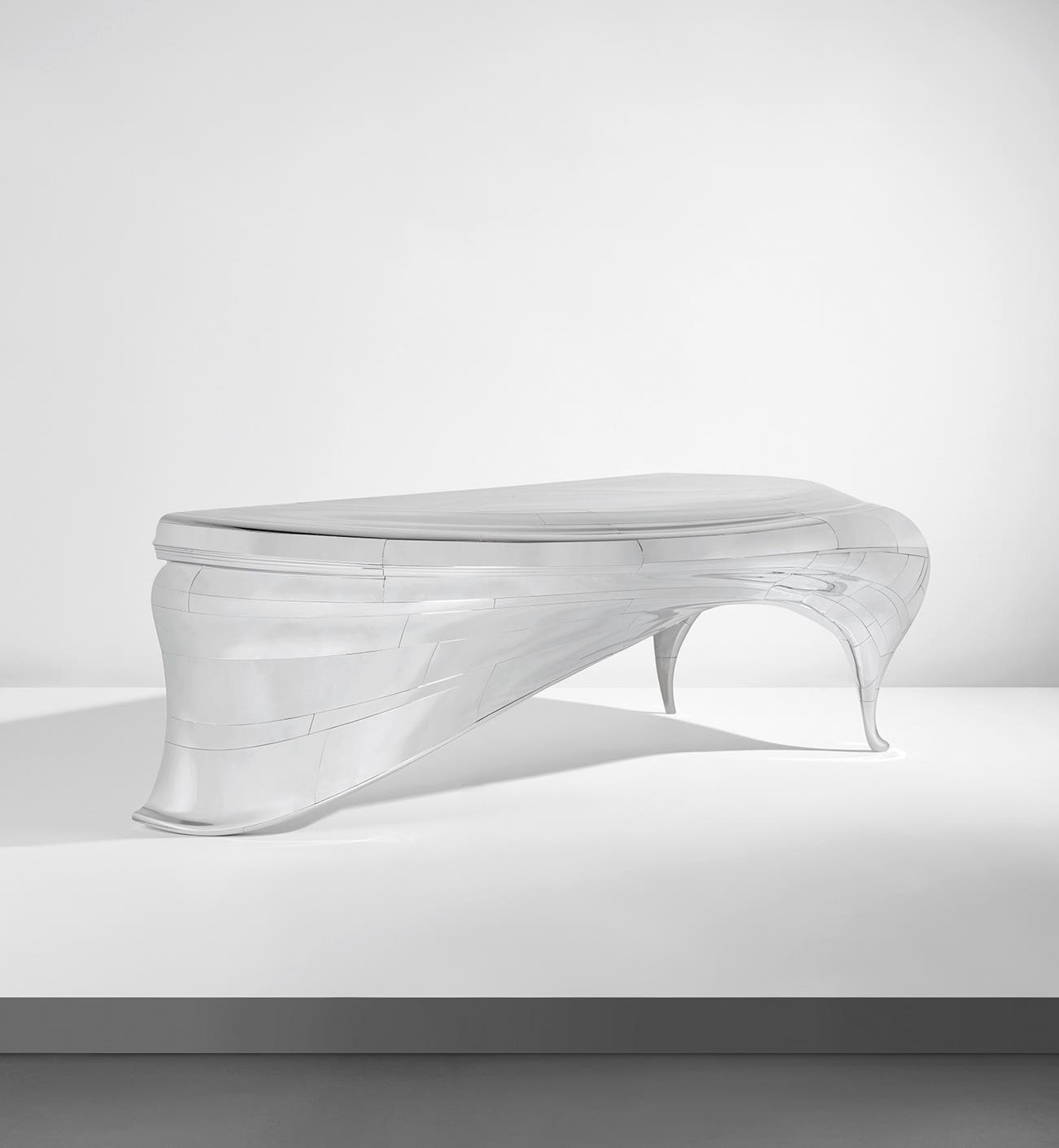 Lectori Salutem is the successor to the Cinderella Table, and like many Hollywood sequels, involves higher production values brought to the same basic premise. Working with Joep’s collaborative support (the twins have since become a formal design partnership), Jeroen conceived a desk which would again be based on an historic silhouette, in this case taken from a drawing by the fin-de-siècle ébeniste François Linke. The shape sweeps outward from a single contour line at one end, curving in a wide arc to full three-dimensionality at the other. This makes for an even more voluptuous volume than that of the Cinderella Table, but the more important difference is in the process and materials. Instead of being carved subtractively out of a solid material, the piece was built of many individually formed parts, in recalcitrant stainless steel.