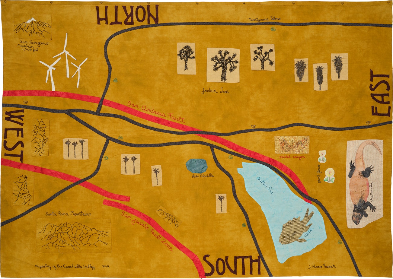 embroidered with the artist's signature, title and date "Mapestry of the Coachella Valley 2012 J. Homer French" lower edge