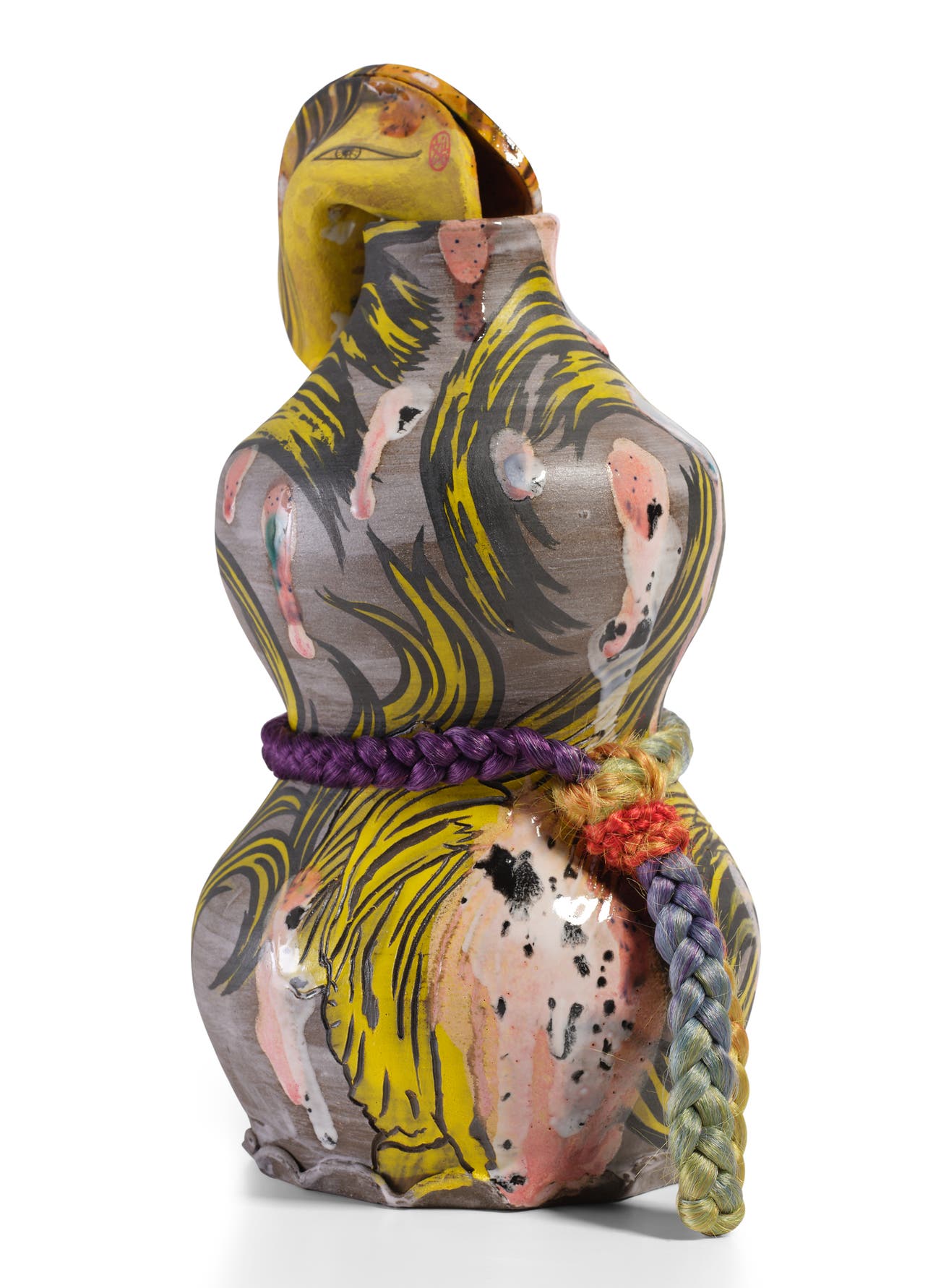 earthenware, porcelain slip, underglaze, glaze and synthetic hair