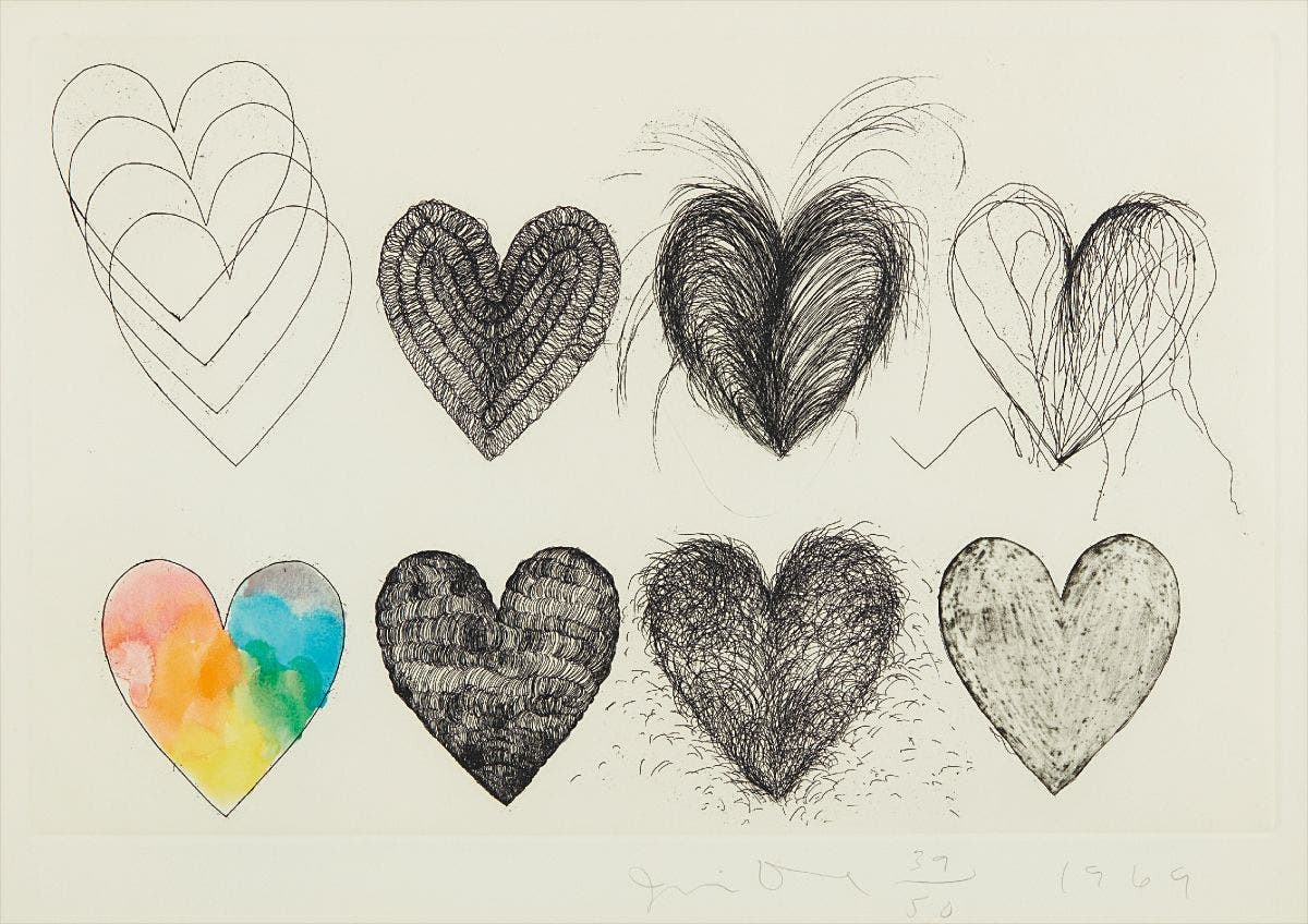American | 1935There's a considerable chance that any given piece of art with a heart has been made by Jim Dine. The artist has been prolific in his 60-plus years of producing works, from large-scale Pop-inflected paintings to emotive and lush collaged works-on-paper. Even while working within a childlike vocabulary, Dine has often been considered alongside rougher painters like Robert Rauschenberg and Jasper Johns, and has surprised critics and audiences by flexing his muscles as an original generator of performance art "Happenings" or towering series of sculptures.