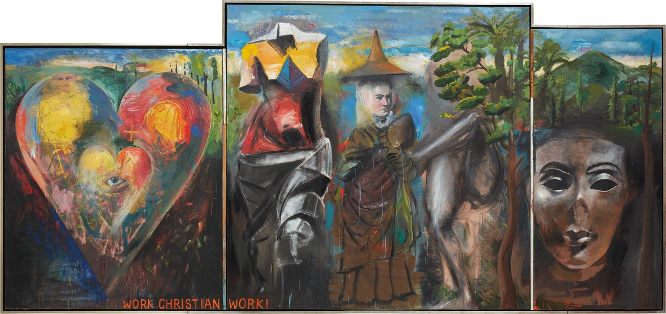 An expressive patchwork of multicolored brushstrokes, Jim Dine’s Work, Christian, Work! (after Creeley) from 1987 occupies the liminal space between dream-like realism and allover abstraction. Executed across three expansive canvases, the present lot pays homage to the artist’s dear friend and celebrated poet, Robert Creeley, whom Dine first met in 1967. Engaging with such legacies of Pop Art, Abstract Expressionism and Surrealism, Work, Christian, Work! (after Creeley) nevertheless defies such easy categorizations. The present work debuted at The Pace Gallery’s 1988 exhibition Jim Dine: New Paintings, just a year after its creation. In his introductory essay published in the exhibition catalogue, Carter Ratcliff discusses how the artist’s paintings from this decade deftly hover between abstraction and realism. He writes, “Dine turns to the visible world for imagery, yet I compare him to an abstract painter because he arranges images of places and things with a freedom seen only in the wake of Pollock’s allover painting…Alloverness is anti-composition, so Dine’s work of the 1980s presents the astonishing spectacle of images well-drawn, hence primed for secure places in well composed pictures, yet floating free in allover fields…By accepting and reinventing alloverness, Pollock’s legacy, he insists that he is American” (Carter Ratcliff, Jim Dine: New Paintings, exh. cat., The Pace Gallery, February 5 - March 5, 1988, n.p.).