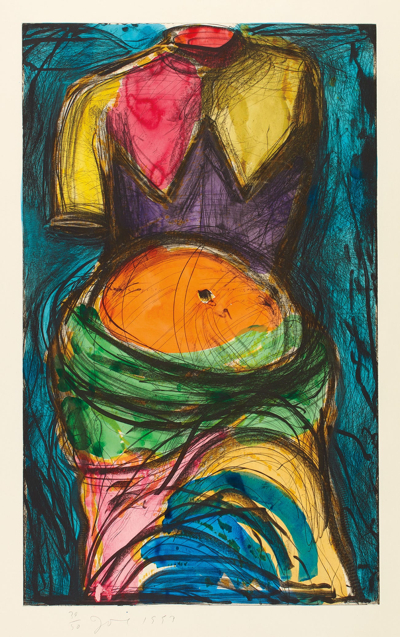American | 1935There's a considerable chance that any given piece of art with a heart has been made by Jim Dine. The artist has been prolific in his 60-plus years of producing works, from large-scale Pop-inflected paintings to emotive and lush collaged works-on-paper. Even while working within a childlike vocabulary, Dine has often been considered alongside rougher painters like Robert Rauschenberg and Jasper Johns, and has surprised critics and audiences by flexing his muscles as an original generator of performance art "Happenings" or towering series of sculptures.