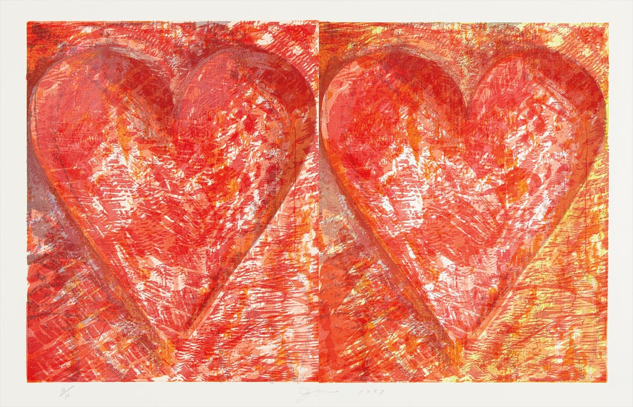 American | 1935There's a considerable chance that any given piece of art with a heart has been made by Jim Dine. The artist has been prolific in his 60-plus years of producing works, from large-scale Pop-inflected paintings to emotive and lush collaged works-on-paper. Even while working within a childlike vocabulary, Dine has often been considered alongside rougher painters like Robert Rauschenberg and Jasper Johns, and has surprised critics and audiences by flexing his muscles as an original generator of performance art "Happenings" or towering series of sculptures.