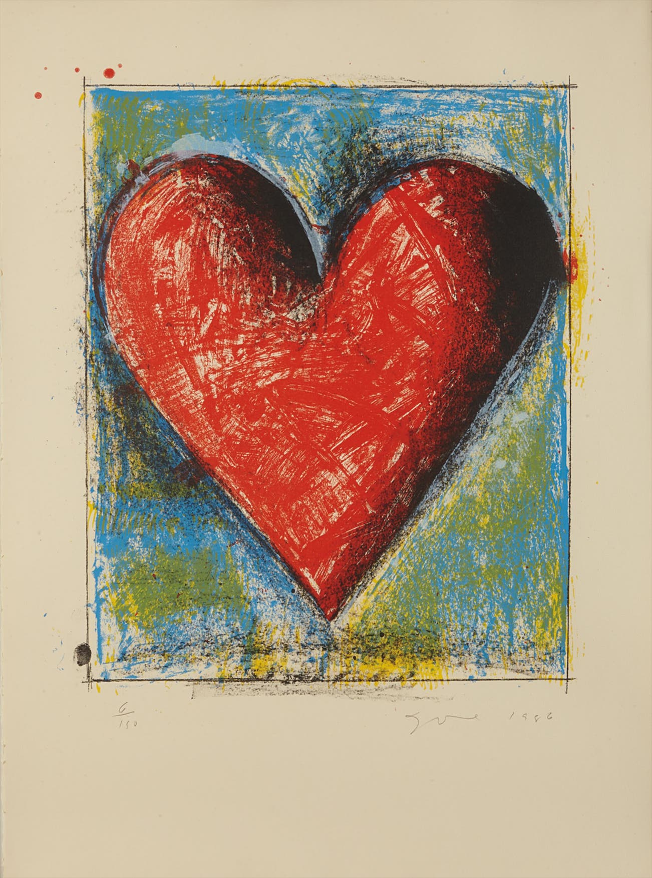 American | 1935There's a considerable chance that any given piece of art with a heart has been made by Jim Dine. The artist has been prolific in his 60-plus years of producing works, from large-scale Pop-inflected paintings to emotive and lush collaged works-on-paper. Even while working within a childlike vocabulary, Dine has often been considered alongside rougher painters like Robert Rauschenberg and Jasper Johns, and has surprised critics and audiences by flexing his muscles as an original generator of performance art "Happenings" or towering series of sculptures.