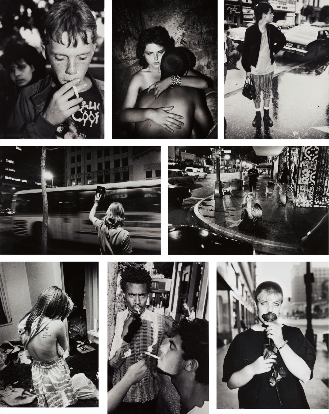 Titles include: 5pm Hollywood Blvd, 1989; Hollywood 3am, 1988; Ragdoll with Patent Leather Purse, 1990; Destiny's Shiny Bracelet, 1989; Bus Stop, 1989; Early Morning, Plummer Park, 1990; Macki with Red Rose, 1989; Casper, Ian's Youth Shelter, 1991