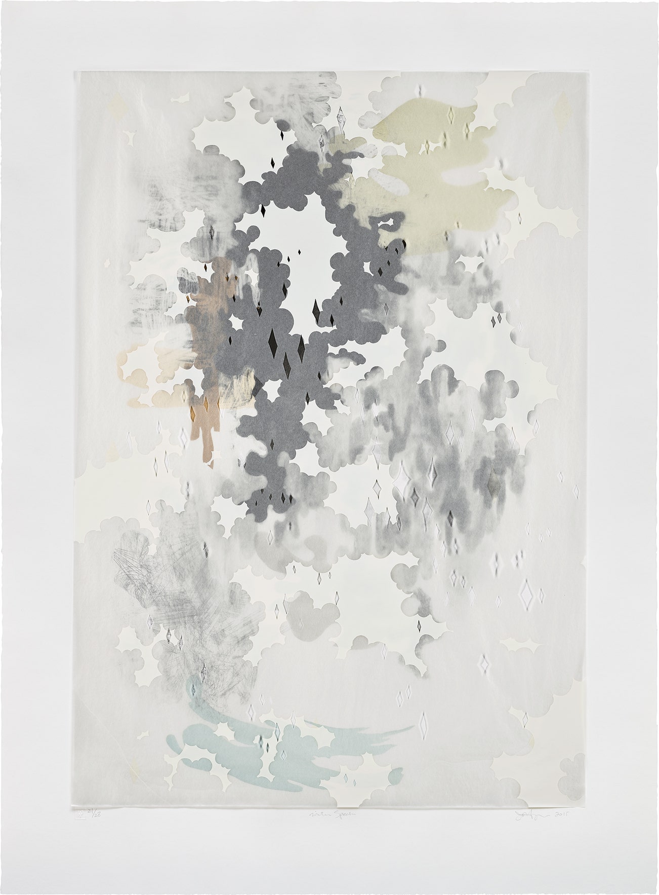 Screenprint in colors, on hand-cut glassine paper, tipped onto intaglio and screenprint on white wove paper, with full margins.