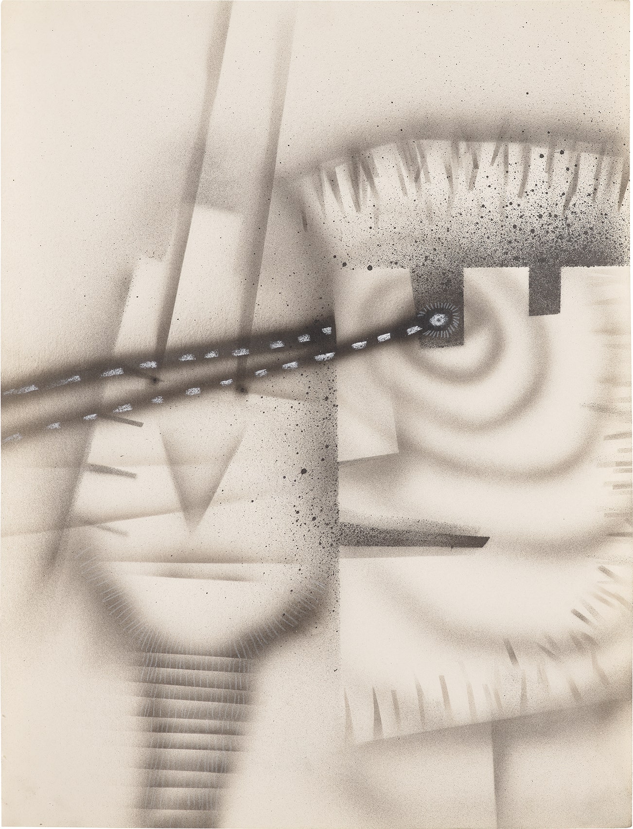 Unique airbrush and pencil drawing, on wove paper, framed.