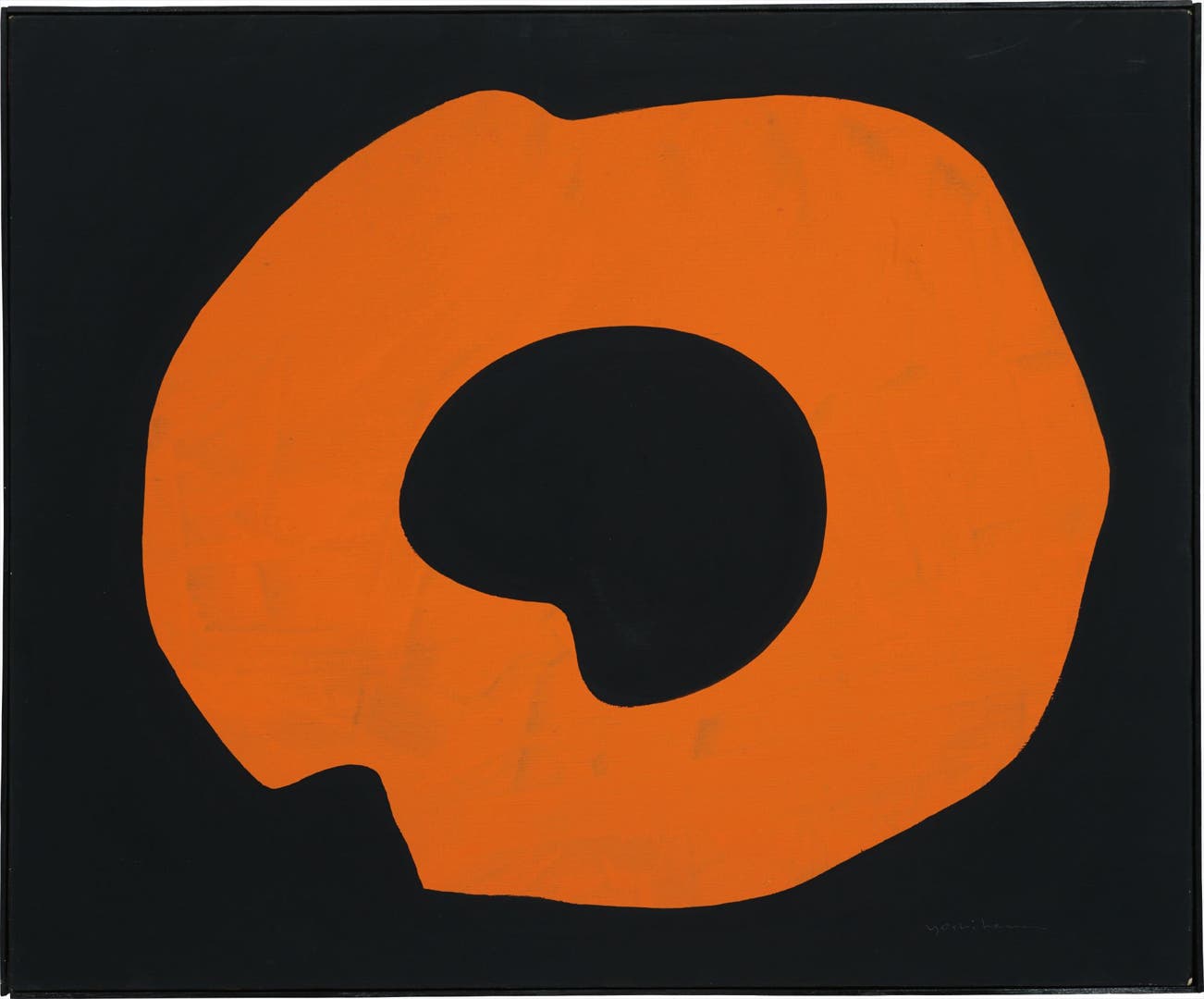 In this sublime work, Untitled, the deep ochre circle starkly floats on the pitch dark background, representing one moment of sublimation of this motif in Yoshihara’s decade-long obsession with it. Upon close observation, one can clearly detect traces of brushstrokes within the thick line of this circle. Unlike the calligraphic movement in lines that Yoshihara used in his 1950s abstract experiments, this work exposes a much slower passage of time through the accumulation of strokes; Yoshihara was painting rather than writing. According to Mr. Koichi Kawasaki, former Director of the Ashiya City Museum of Art and History, Japan, and a leading authority on Gutai, the painting was executed circa 1965. It also carries a Certificate of Authenticity Registration issued by the Japan Art Dealers Association. As a number of his last works used stroke shapes of Japanese letters, mostly Kanji characters, one can only assume that in his last years Yoshihara was searching for the thin line between painting and writing.