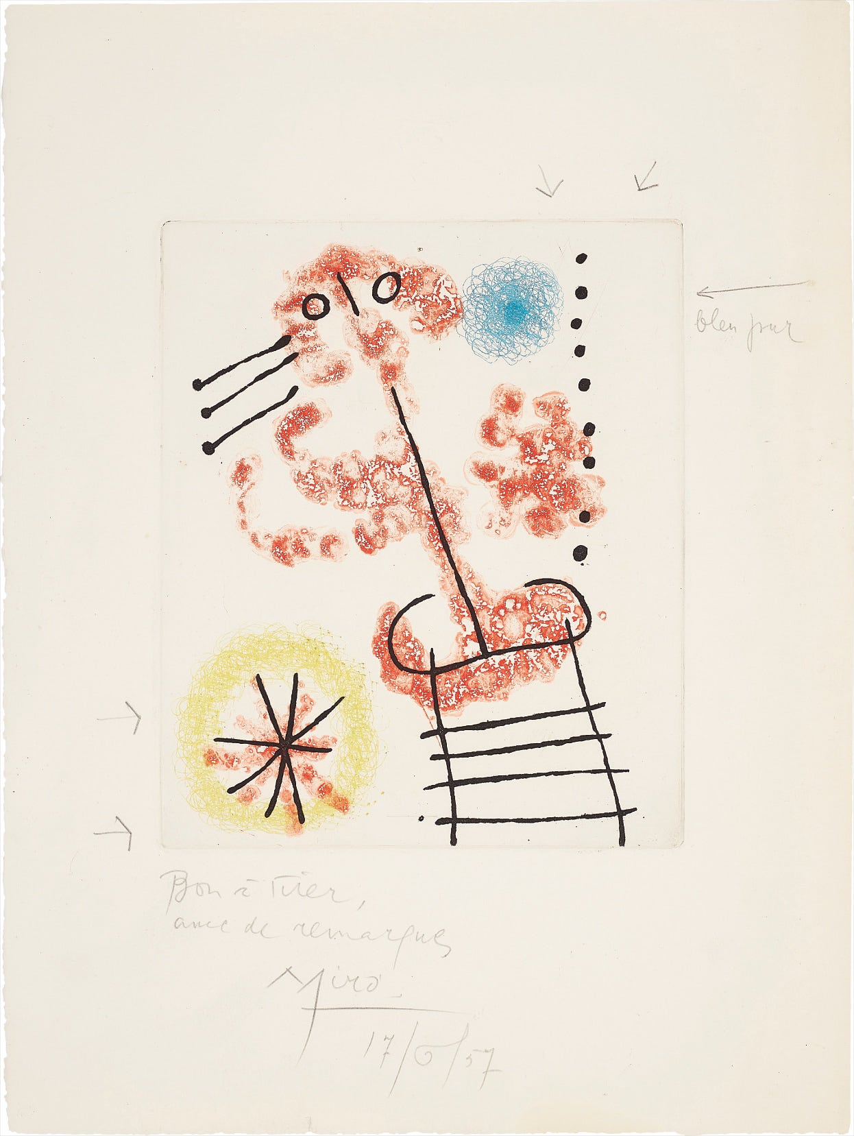 Signed, dated '17/6/57' and annotated 'Bon à tirer, avec des remarques' and 'bleu pur' (pure blue) with arrows by Miró in pencil (the good-to-print proof impression, before the edition of 50 on Rives paper, 10 on Japanese paper and 12 proofs on Rives paper touched-up by the artist), printed by Crommelynck et Dutrou and published by Louis Broder, Paris, unframed.